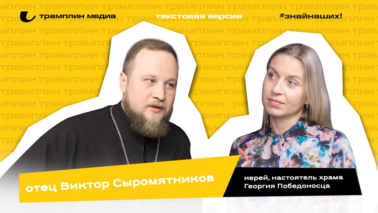 – Приветствую всех! Вы смотрите медиа «Трамплин», подкаст «Знай наших!». Сегодня у нас в гостях отец Виктор Сыромятников, иерей, руководитель пресс-службы и настоятель храма Св. Георгия Победоносца. Отец Виктор, здравствуйте, приветствую вас!
