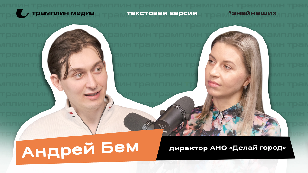 — Вы слушаете и смотрите подкаст «Знай наших!» на медиа «Трамплин». Мы сегодня беседуем с Андреем Бемом. Андрей — директор автономной некоммерческой организации (АНО) «Делай город», автор общественных проектов. Андрей, здравствуйте!