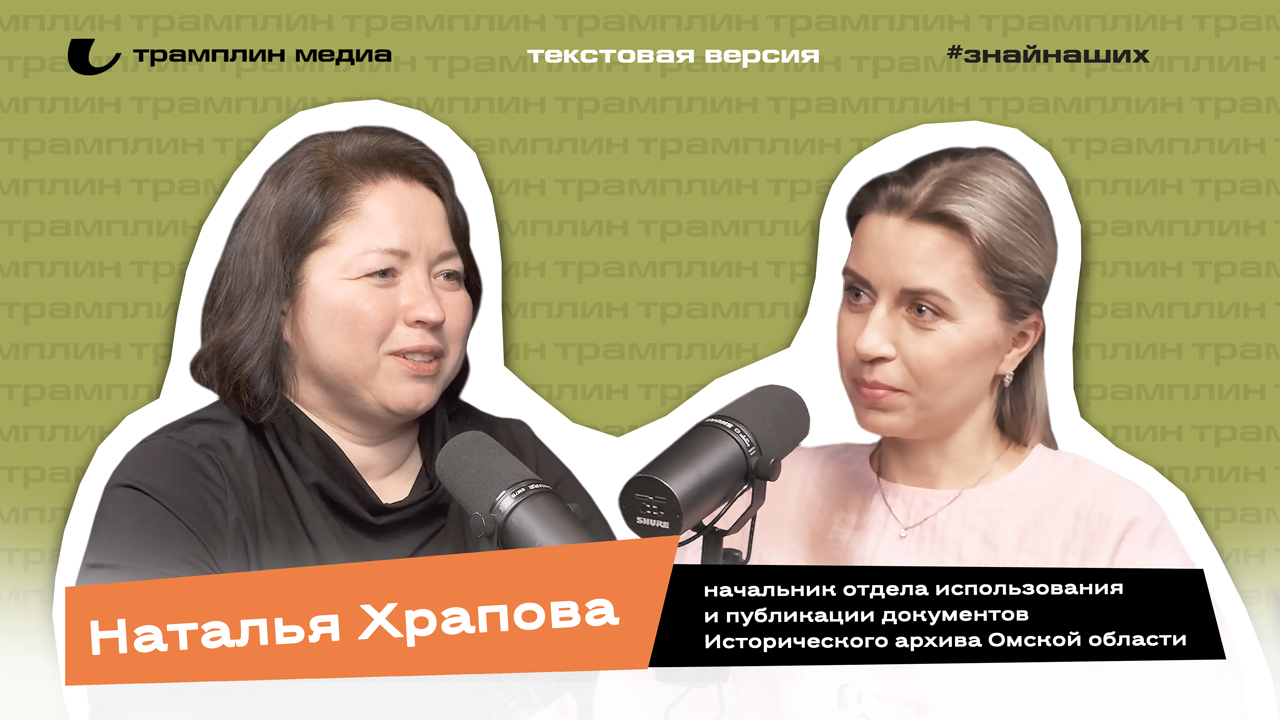 — Здравствуйте! Вы смотрите и слушаете подкаст «Знай наших!» на медиа «Трамплин». Сегодня у нас в гостях Наталья Храпова, начальник отдела использования и публикации документов Исторического архива Омской области. Наталья Святославовна, здравствуйте!