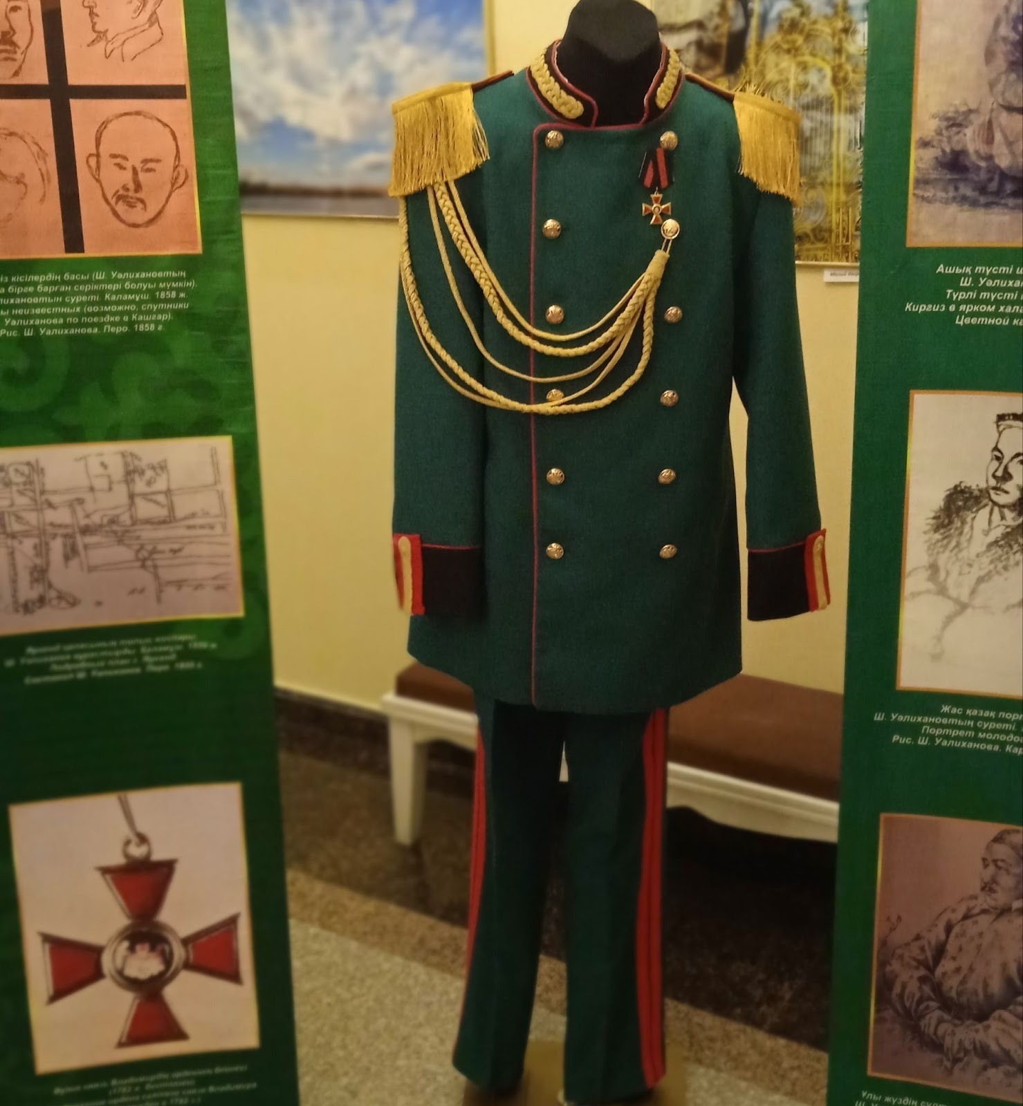 Образец мундира офицера Валиханова, рисунок ордена святого Владимира, которым учёный был награждён за экспедицию в Кашгар, рассказывают о жизненном этапе Чокана Валиханова как офицера и даже разведчика. Дело в том, что в XIX веке Кашгар являлся закрытой территорией Китая и попасть туда мог не каждый. Валиханов не побоялся запретов, вместе с торговым караваном поехал туда, прожил год и, собрав ценные сведения, вернулся в Омск, затем в Петербург. Царское правительство высоко оценило бесстрашие Валиханова, а часть сведений, добытых им, засекретило на сто лет.