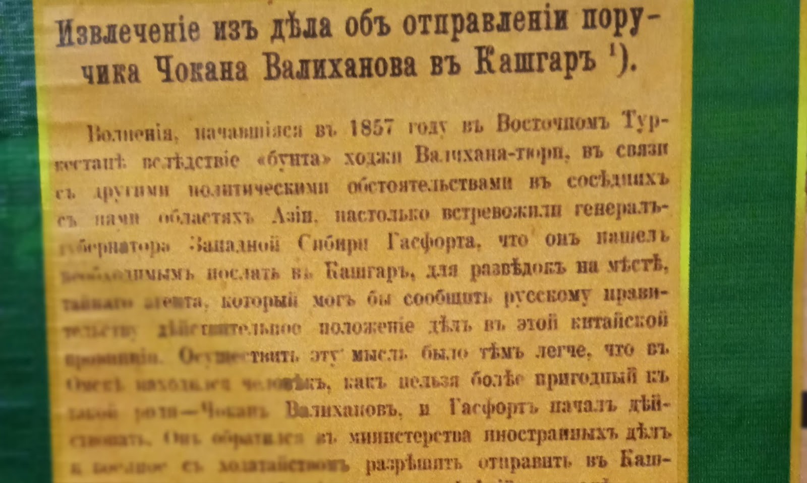 Чокан Валиханов, принимая участие в военно-научных экспедициях по Азии, первым сделал научную запись киргизского эпоса «Манас». А в 1856 году учёный направился в китайский город Кульджа с дипломатической миссией, благодаря которой удалось установить дружеские связи между Россией и Китаем. По личному распоряжению императора Александра II Валиханов был награждён орденом святого Владимира.