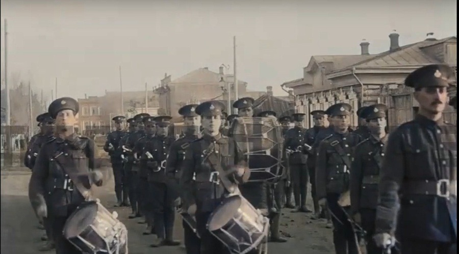 На видео видно, что британские военные музыканты строем уходят по улице Думской к ее началу в сопровождении толпы. Авторы предполагают, что они идут в расположение части, вероятнее всего находившееся в двухэтажном каменном здании на ул. Московской, 58 (ныне проспект Маркса, 15, офисный центр).