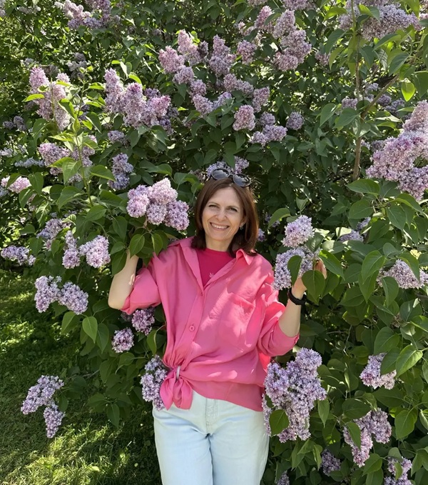 — Мой сад создан из красивых декоративных растений вперемешку с плодово-ягодными. Каркас сада составляют сосна, туя, груша, яблоня декоративная, сирени — очень их люблю, для меня это волшебная красота, всегда жду цветения сиреней. Можжевельники тоже в каркасе сада. Они вечнозелёные и красивы 12 месяцев в году. Много спиреи, их использую в цветниках единым полотном. Много весенних луковичных. На самом видовом солнечном месте -— розарий. Я отобрала пять сортов роз, которые очень люблю по колеру и неприхотливости. Я человек занятой, поэтому мой розарий создан из роз, которые хорошо зимуют, цветут долго и обладают генетической устойчивостью к грибным заболеваниям, поэтому розы свои я не обрабатываю от болезней. И ещё в цветниках растёт тимьян, шалфей, посконник, астильбы. В теневом цветнике дербенник и анемона японская.