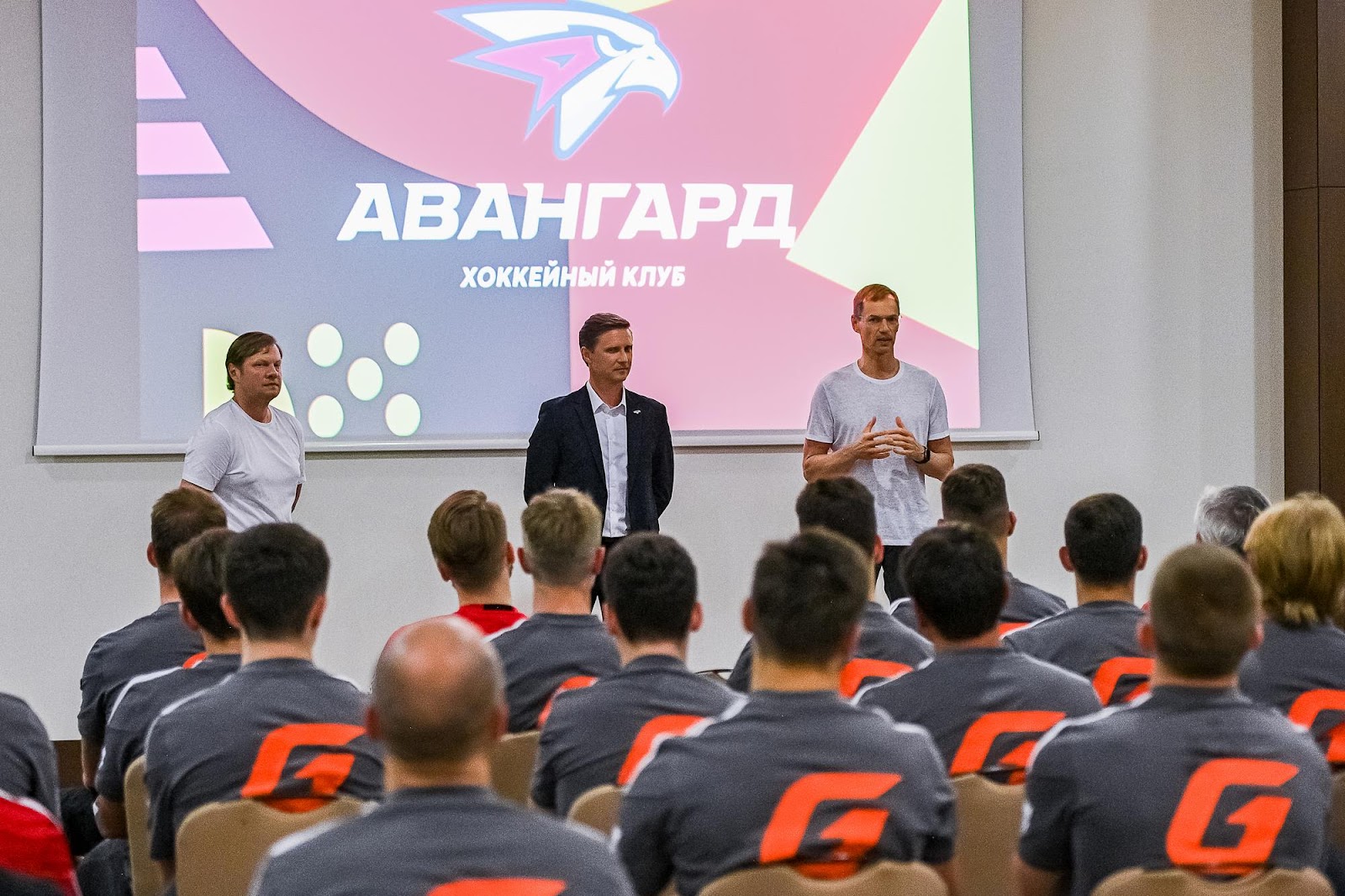 Игроки «Авангарда» знакомятся с новым гендиректором клуба Германом Чистяковым (крайний справа).