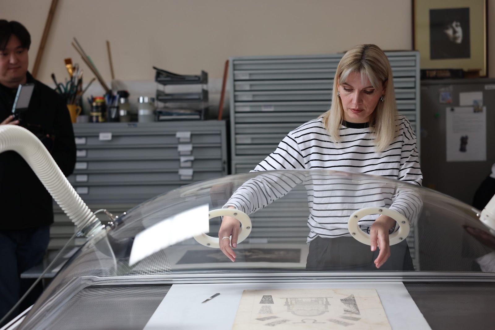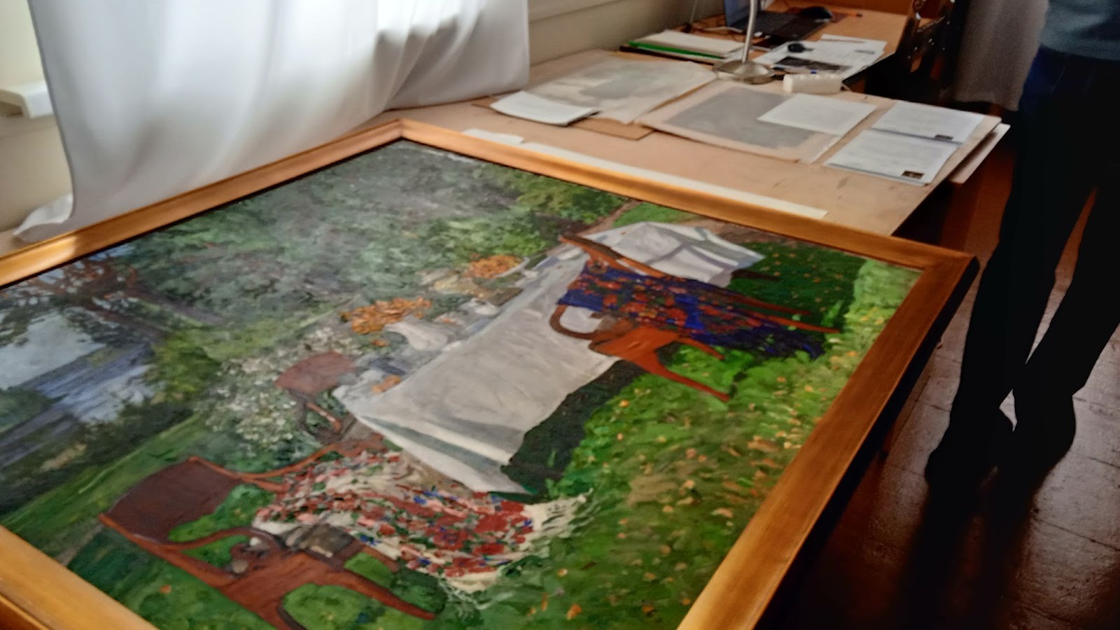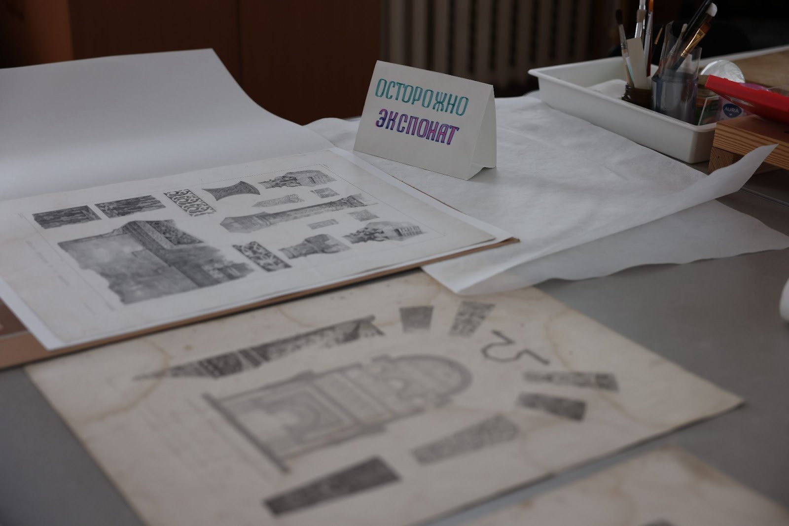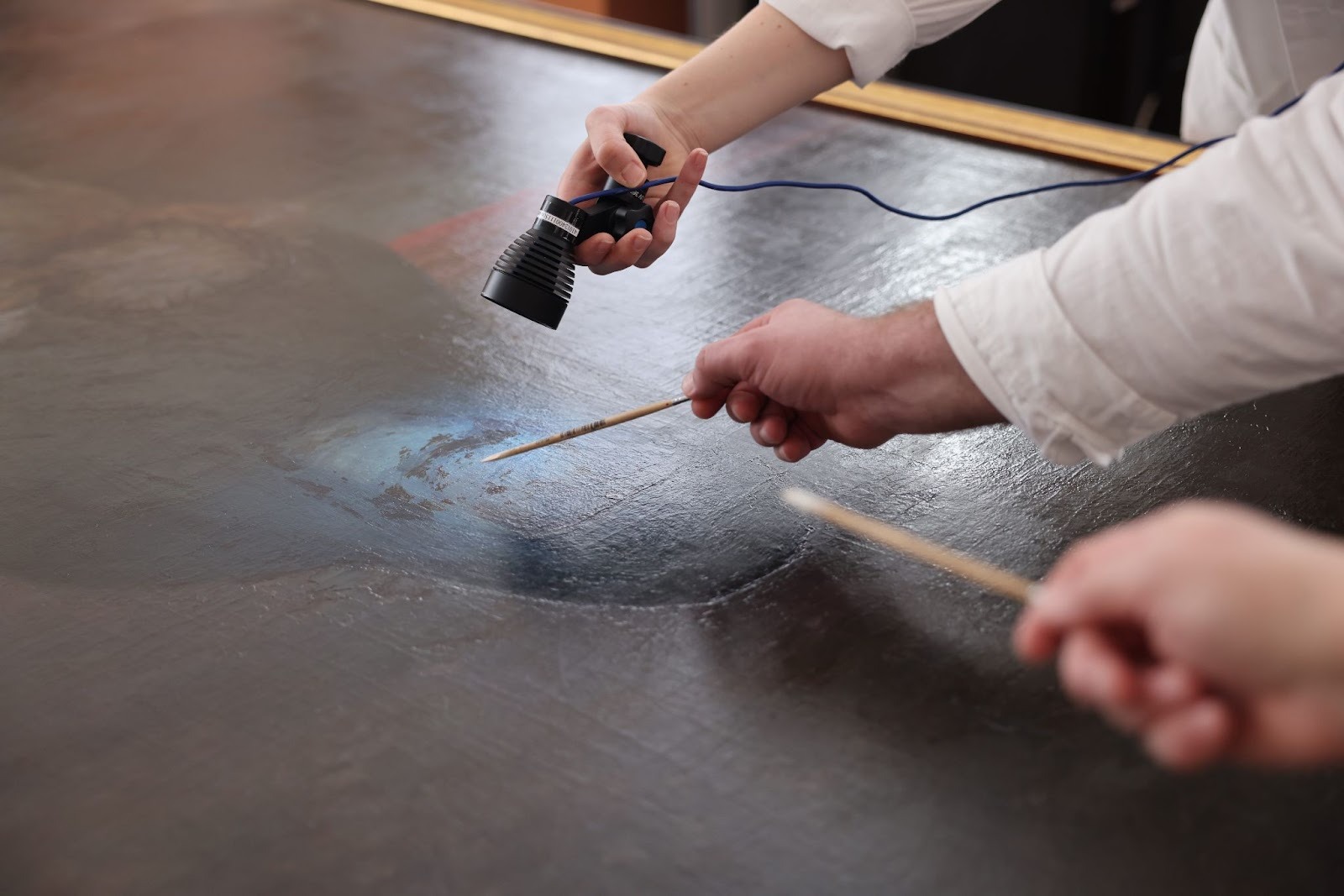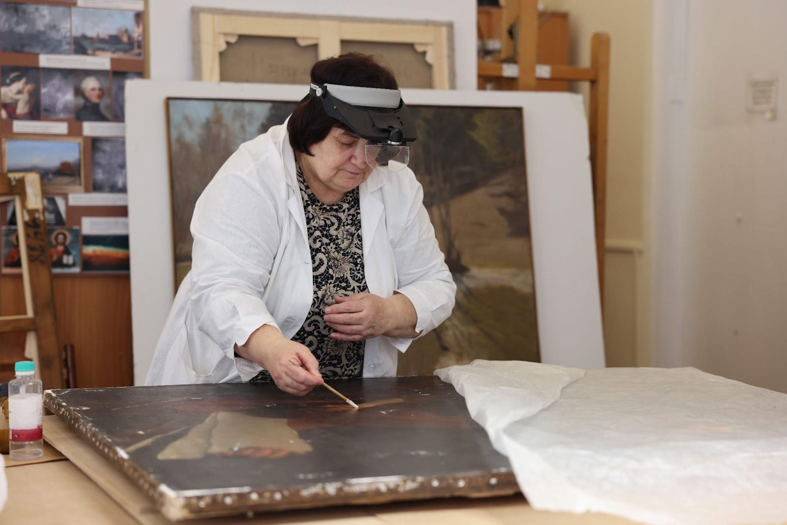 В другом случае отсутствовал крупный фрагмент бумажной основы на картине художника Николая Третьякова. Утрату восстановили с помощью метода доливки на вакуумном столе – аппарате размером с токарный станок. Реставраторы взяли колбу. Налили в неё дистиллированную воду, положили внутрь измельченную бумагу, а когда та набухла, при помощи блендера превратили содержимое в густую смесь, которую с ювелирной точностью наложили на место утраты.