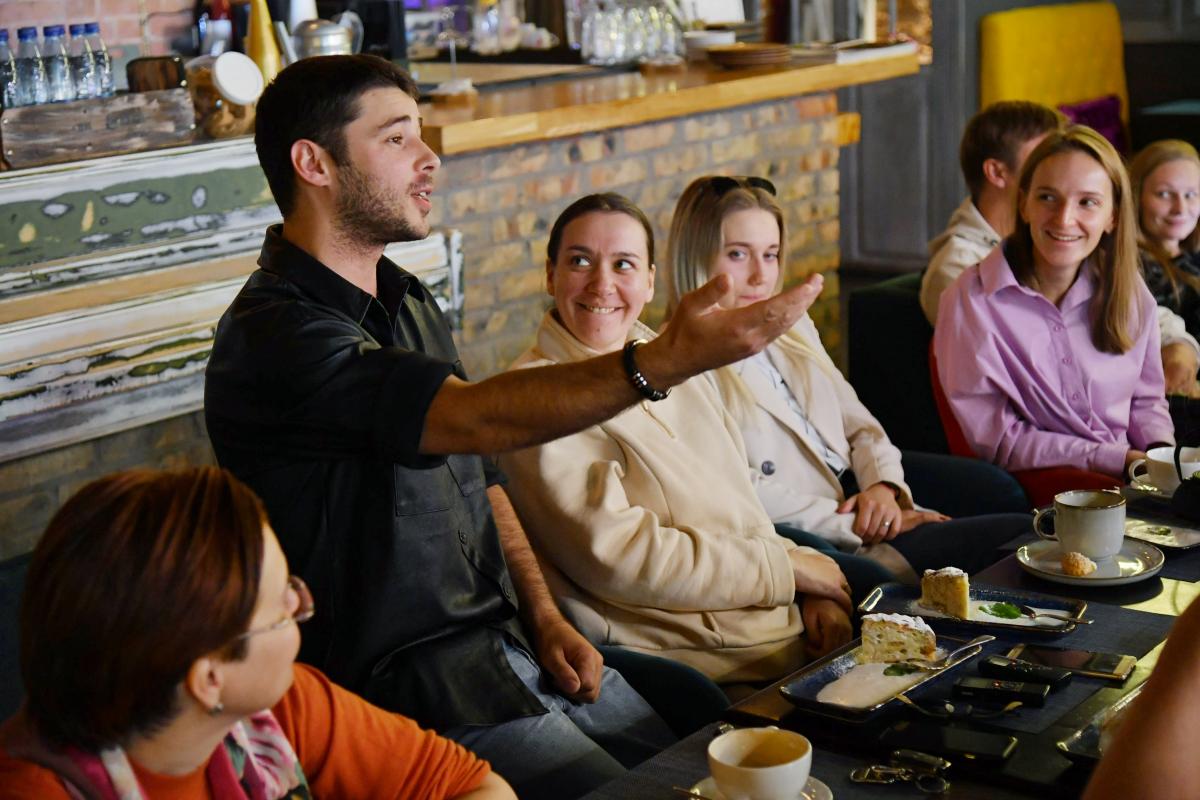 Гостями завтрака были автор сценария и режиссёр спектакля Кристина Лапшина (кстати, она снялась в фильме с Сергеем Безруковым, об этом читайте здесь), актёры Степан Дворянкин, Артём Ильин, Ксения Шабальникова и зампредседателя омского отделения Союза театральных деятелей России по развитию Дома актёра Наталья Швирст.