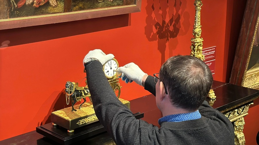В понедельник музеи закрыты для посетителей. Но это не значит, что в залах пусто: именно в «выходной» день хранители и реставраторы занимаются своей работой – осматривают экспонаты, стирают пыль, регулируют свет. И именно в такой сентябрьский понедельник во Врубелевском корпусе Омского музея изобразительных искусств прошёл закрытый пресс-показ, посвящённый закулисной работе хранителей и реставраторов. Центральным событием стало знакомство журналистов с уникальным экспонатом – каминными часами первой четверти XIX века «Повозка Вакха». Недавно прошла их масштабная реставрация в сотрудничестве с Государственным Эрмитажем.
