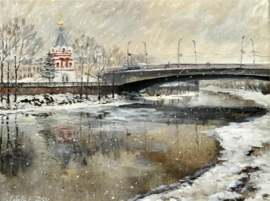 Другая картина, «Две стихии», на которой изображена борьба воды с небом, а между ними — то, что их уравновешивает, Серафимо-Алексеевская часовня у Юбилейного моста. Как символ веры.