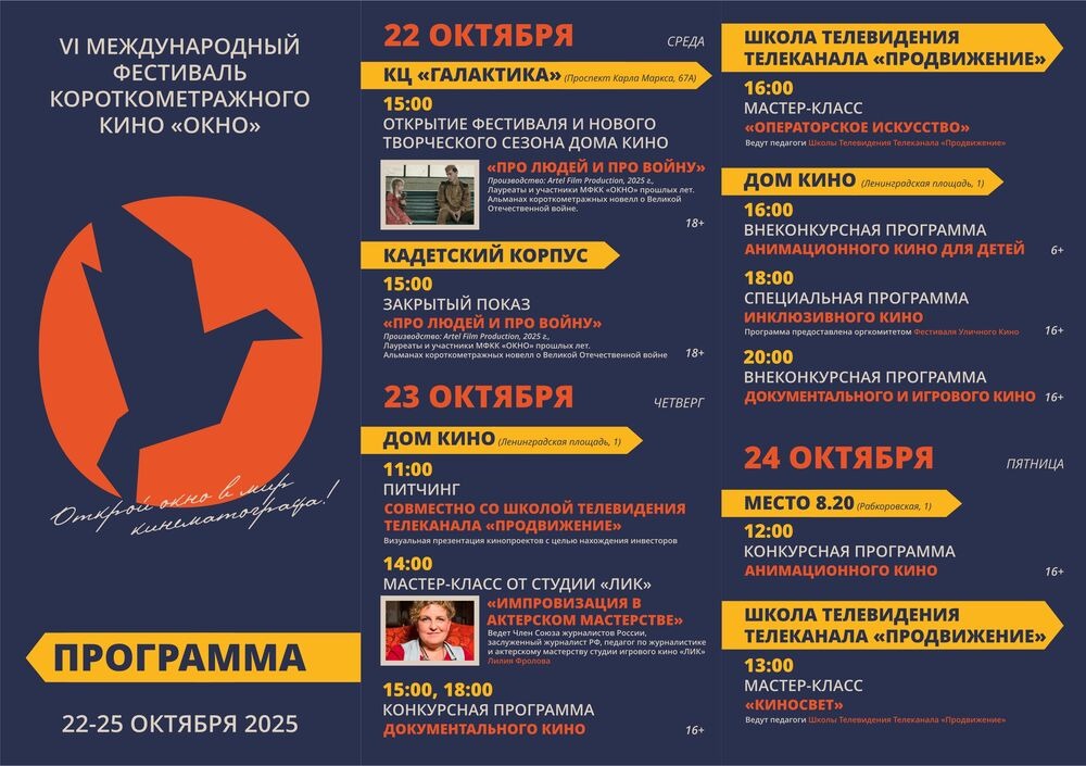 Торжественное открытие «ОКНА» состоится 22 октября в 15:00 в киноцентре «Галактика» показом уникального фильма «Про людей и про войну» — альманаха короткометражных кинолент от петербургской киностудии Artel Film Production. Этот проект, уже зарекомендовавший себя на фестивале «ОКНО» прошлых лет, представляет собой девять трагичных, но вдохновляющих новелл, основанных на реальных историях людей, переживших тяготы Великой Отечественной войны. Альманах раскрывает глубокие и личные истории, оставляя неизгладимый след в сердцах зрителей.