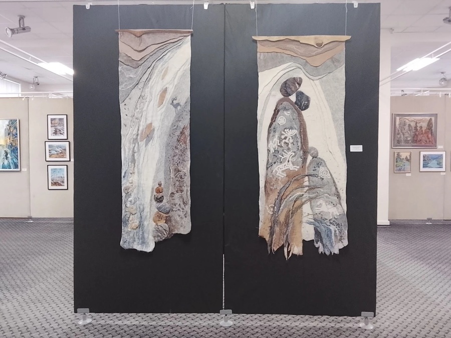 — Будущая центральная часть, где большие вертикальные камни, была сваляна в июле на Всероссийском керамическом симпозиуме «Красный круг» в Хакасии — туда меня пригласили провести мастер-класс по войлоку. Симпозиум проходил на базе отдыха под названием «Зов Предков». Между нашими творческими проектами — керамическими и войлочными, мы посетили много интересных заповедных мест. И мои впечатления о Хакасии вылились в эту работу, — поясняет Юлия.
