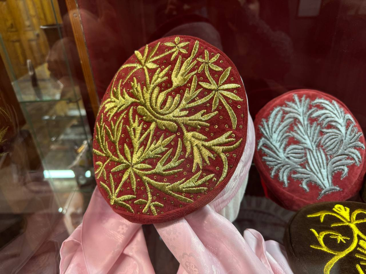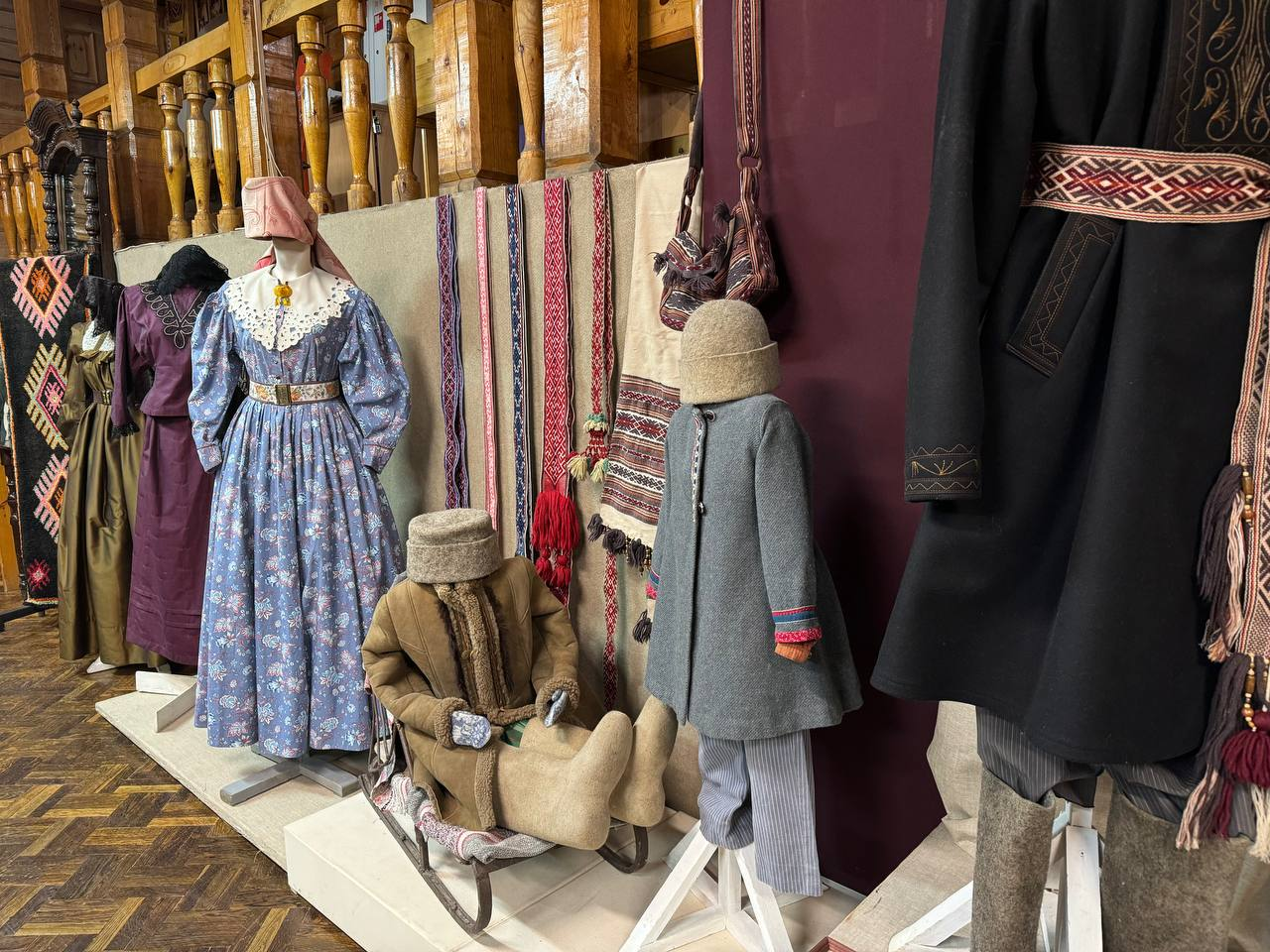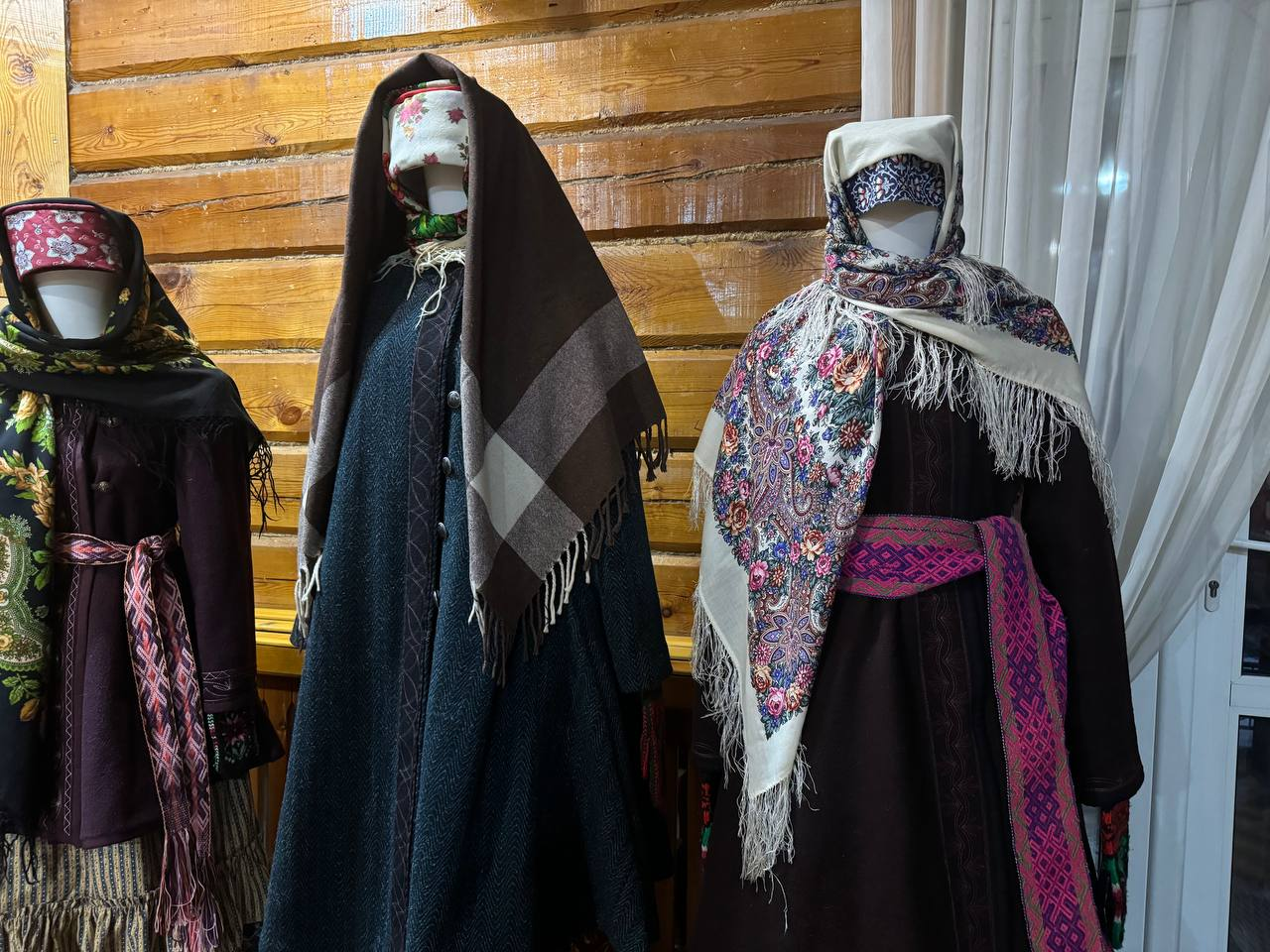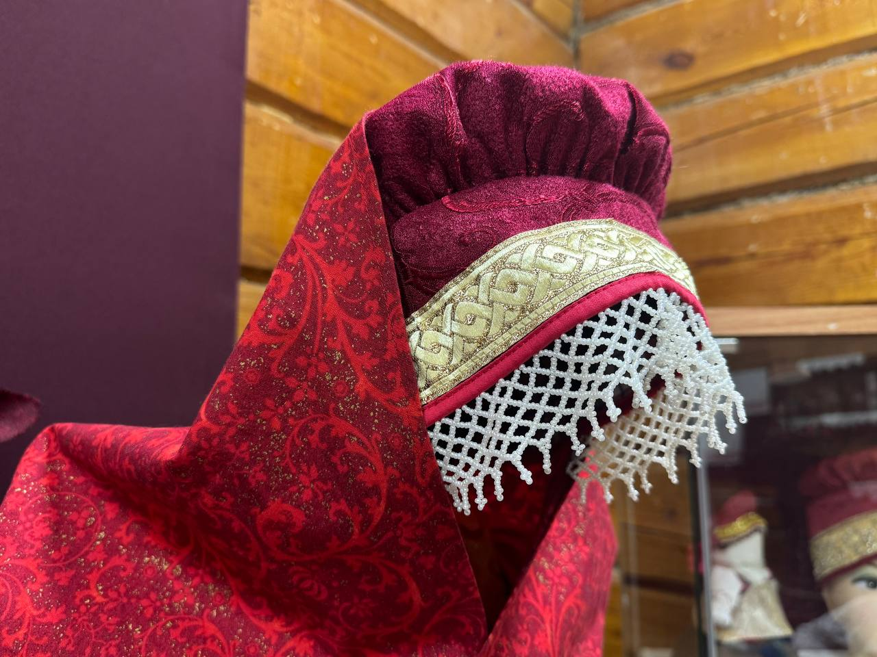 Витрина с головными уборами демонстрирует сборники и шамшуры. У многих из них характерное «донце», которое держит форму, а поверх повязывается платок. Для отделки используют и парчу, и имитацию жаккарда. Когда удаётся найти старые отрезы, например, барановские ткани, используют их. Маленькие сумочки-карманы шьют в лоскутной технике и украшают аппликацией и вышивкой. «Такую сумочку ещё называют лакомником, потому что в ней часто девушки носили сладости».