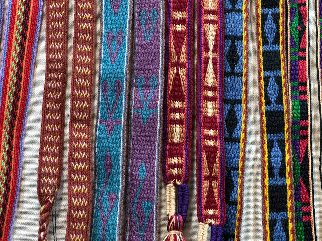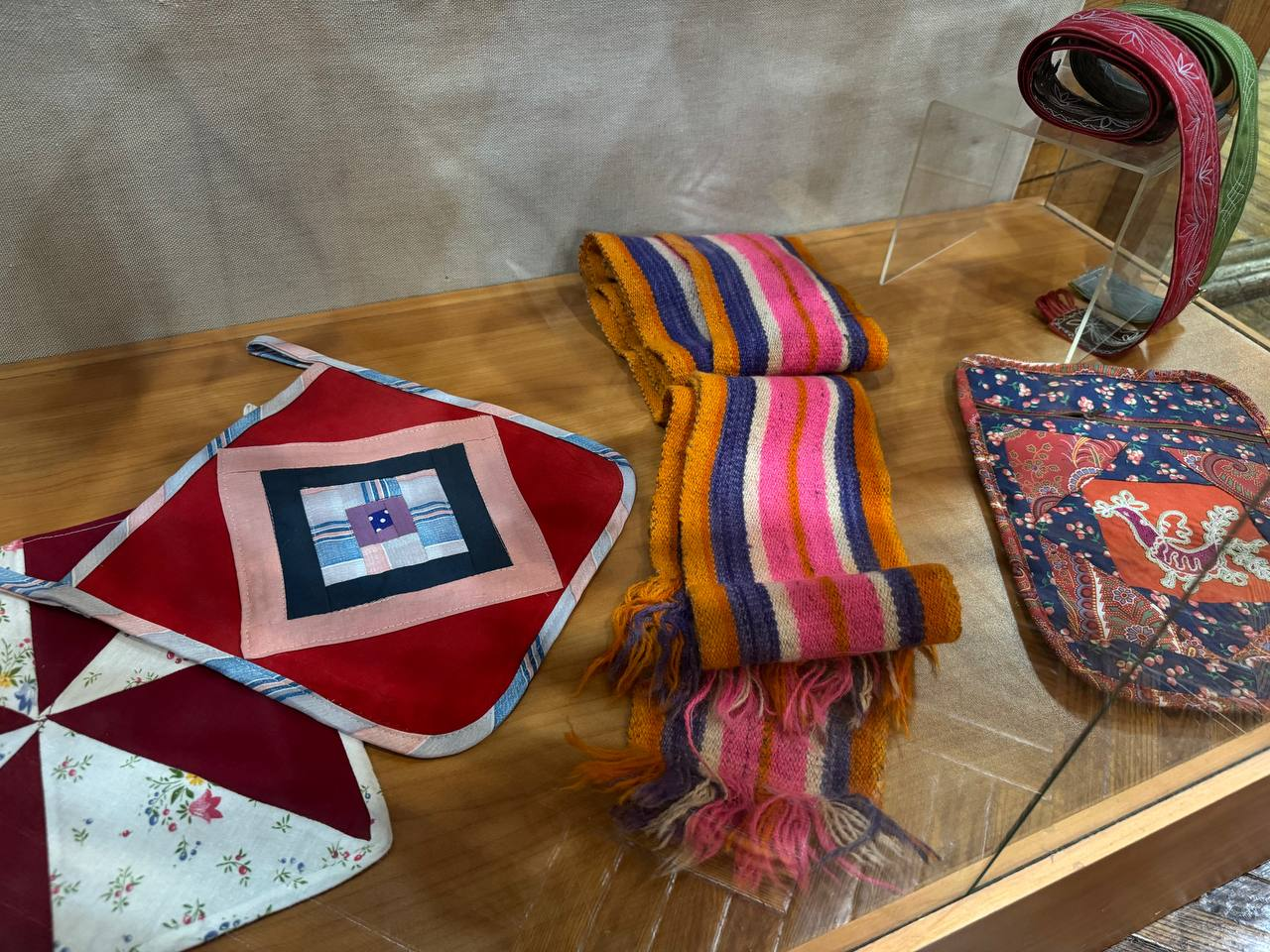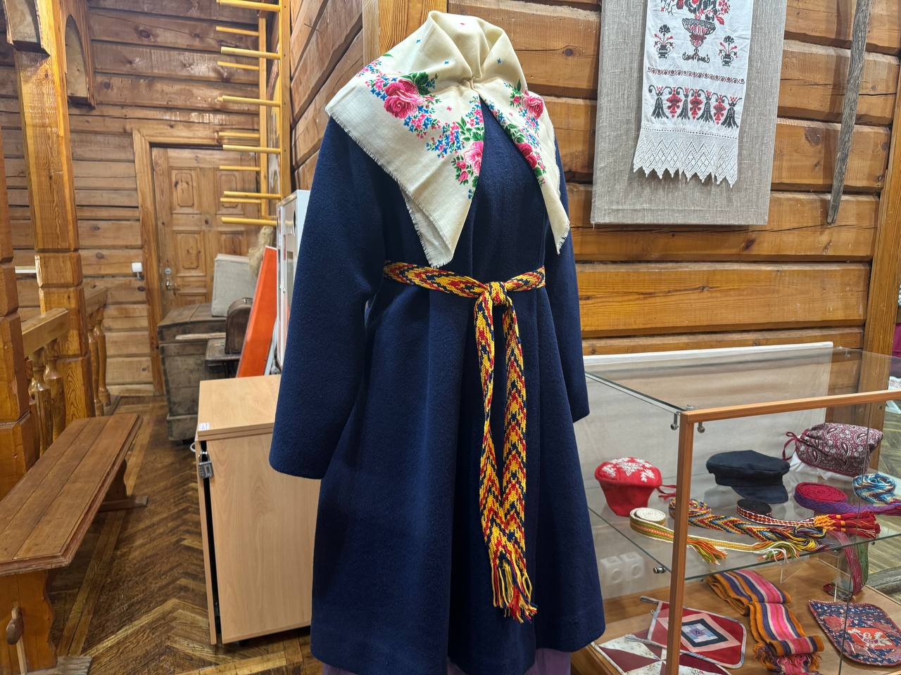 Отдельные витрины посвящены фартукам, поясам и головным уборам. В них тоже прослеживается уральская традиция: например, фартуки сделаны из ткани тёмных оттенков с крупными, яркими орнаментами, вышитыми тамбурным швом, или швом «цепочкой», и меланжевыми нитями. Пояса напоминают настоящие маленькие полотна: от простых шитиков до тонких поясов с орнаментом, иногда с десятками цветовых полос. «Шитики так называются, потому что их шили, а не ткали. Они жесткие, плотные, ткани проклеены. Их украшали строчевой вышивкой», – поясняет Ирина Гуцько.