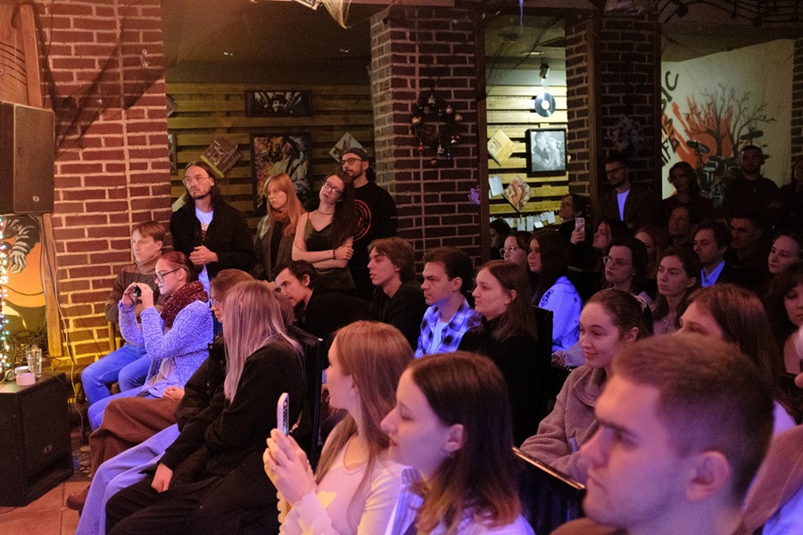 На мероприятиях можно встретить интересных и творческих гостей не только на сцене, но и в зале. Так в качестве зрителя на Выси побывала Юлья Салтанова, вокалистка группы «Азбука Мо» и автор сольного музыкального проекта проекта «этоюлино». Она поделилась с «Трамплином», что вечера интересны не только выступлениями поэтов и музыкантов: