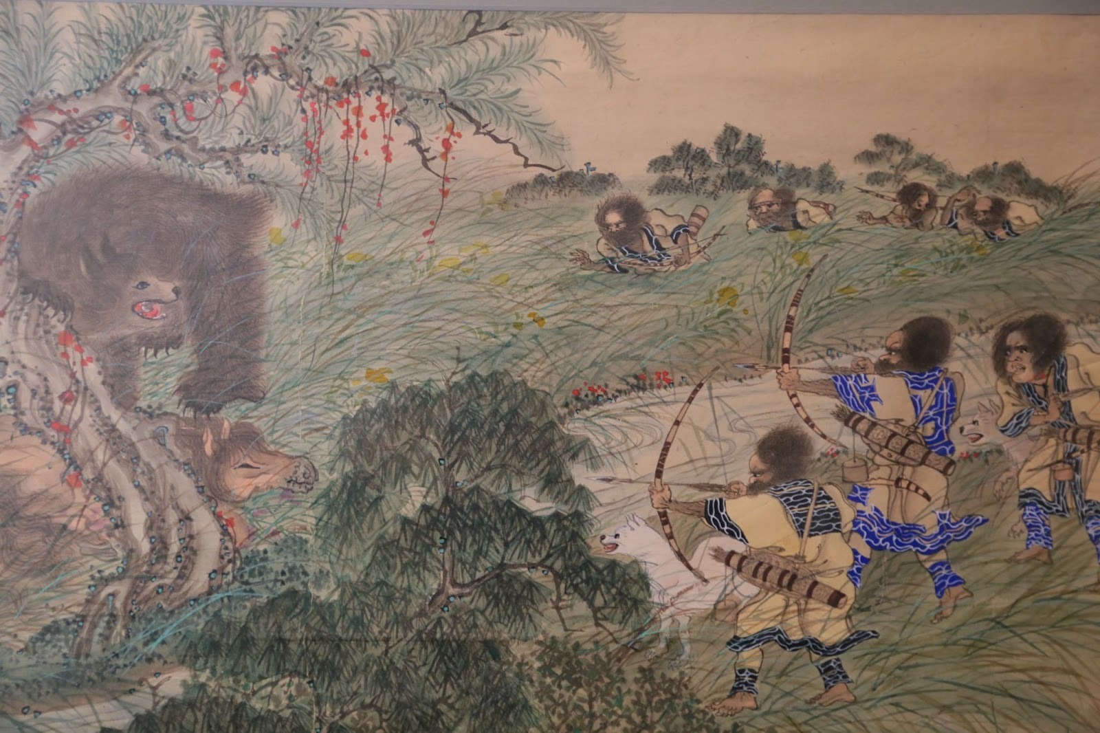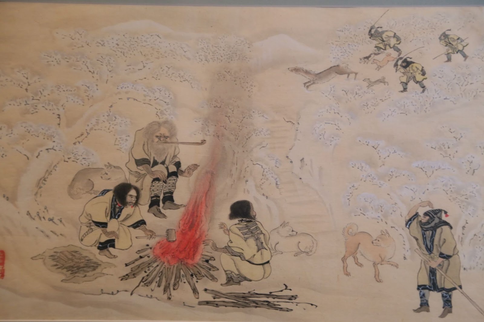 Рисунки, представленные на выставке, отражают повседневную жизнь и обычаи айнов – охоту, рыбалку, моменты радости и печали.