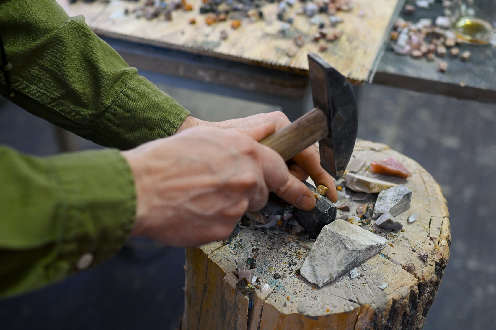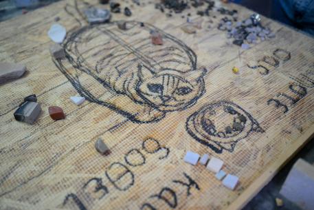 Технология мозаики не изменилась за тысячелетия – Антон стоит у небольшого пенька, в который воткнуто массивное зубило – харди – и молотком высекает нужные модули. Антон признаётся – по пальцам тоже иногда попадает, не без этого. Каждый квадратик называется тессера – что означает «кожа Венеры», набор тессер – графья, а направление рисунка – андаменте. Технологии помогли, пожалуй, только с клеем и основой – сейчас мастерам не нужно замешивать известковые растворы с яйцами, как в древности. Издавна мозаику бьют, а не выкладывают – именно такую, тесно спрессованную в специальных ящиках, и находят в древних римских термах исследователи.