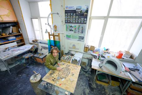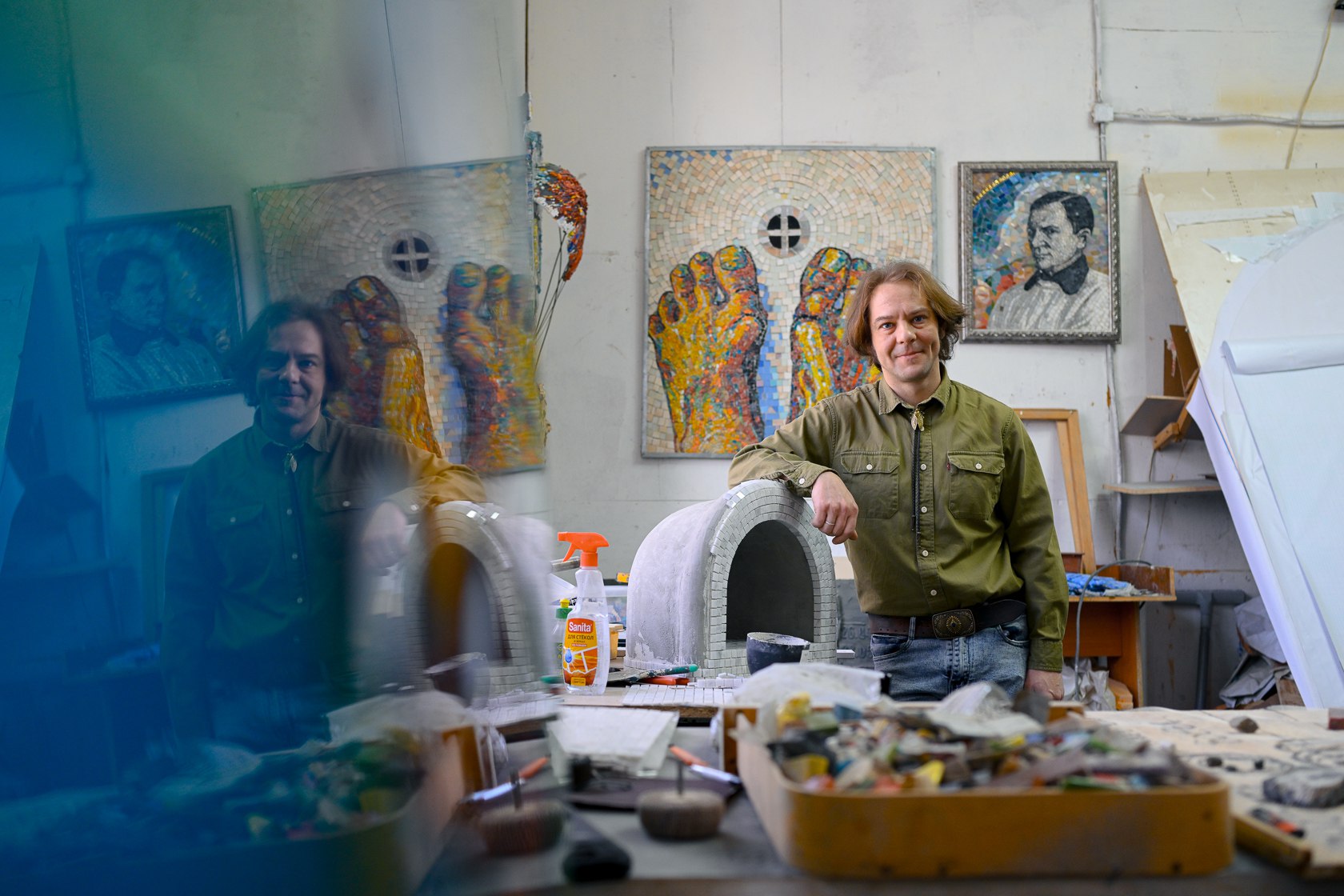 Редакция медиа «Трамплин» продолжает серию материалов «В мастерской художника» – сегодня показываем, что происходит в мастерской мозаичиста Антона Козлова. Почему на стене его мастерской висят «Ноги Церетели» и «Кашпировский», какие мозаичные скульптуры появятся в ближайшее время в городе и почему когда-то Антон сжёг все свои картины – рассказываем в статье.