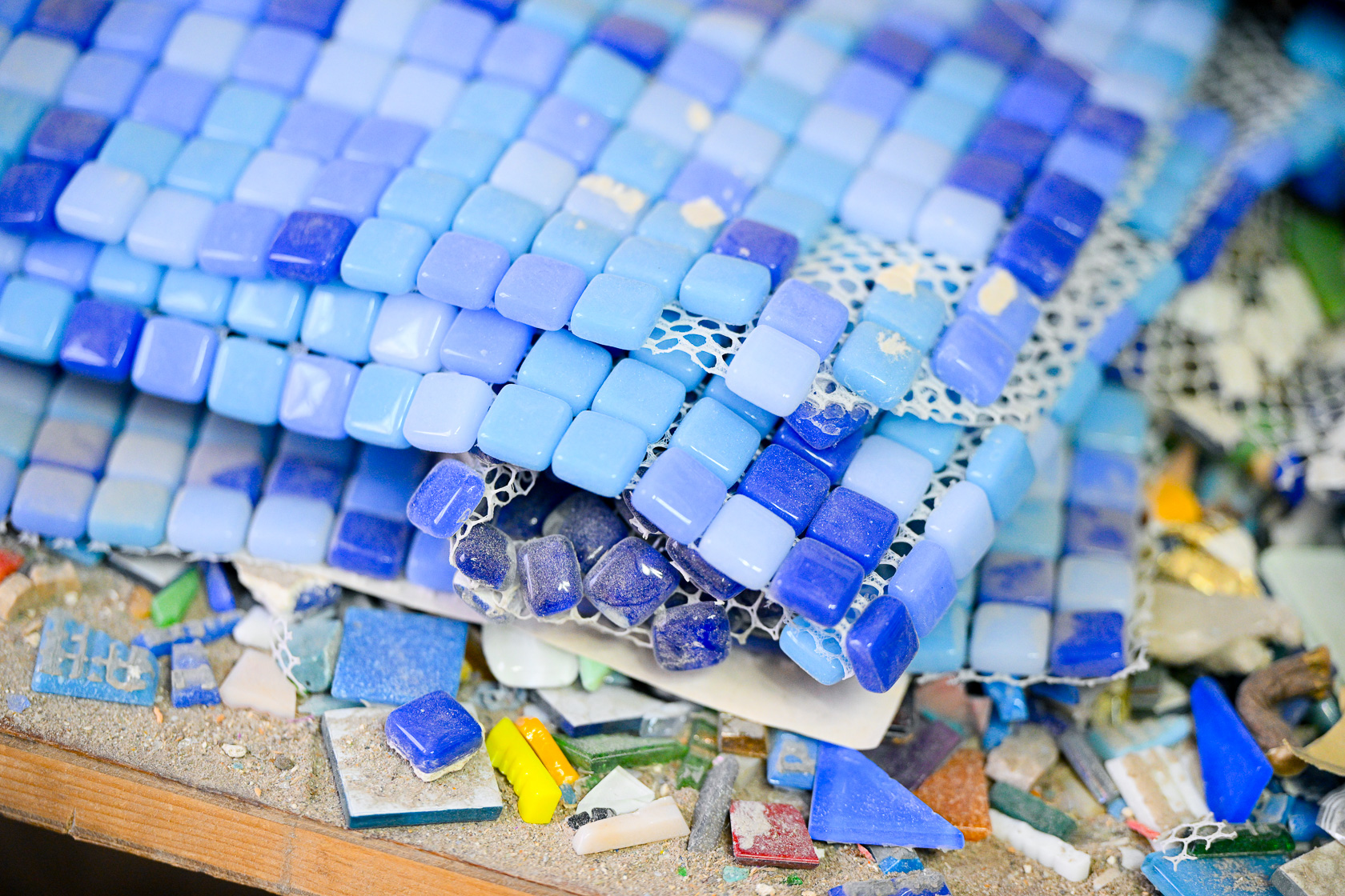 Антон владеет техниками византийской и римской мозаик. Византийская мозаика – преимущественная синяя и золотистая смальта, прямоугольные тессеры. Римская – квадратные тессеры и натуральный камень. Следующий этап – флорентийская мозаика, здесь практически нет швов между элементами, только чистый рисунок. Самая сложная техника, говорит Антон, микромозаика: