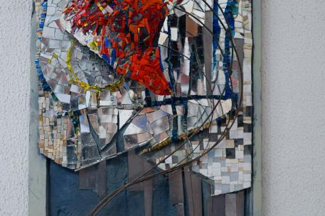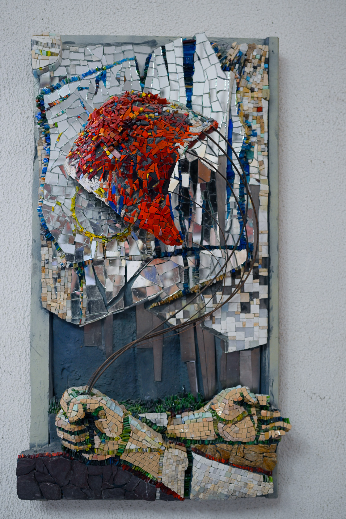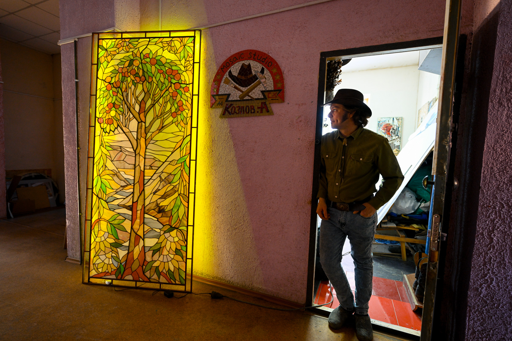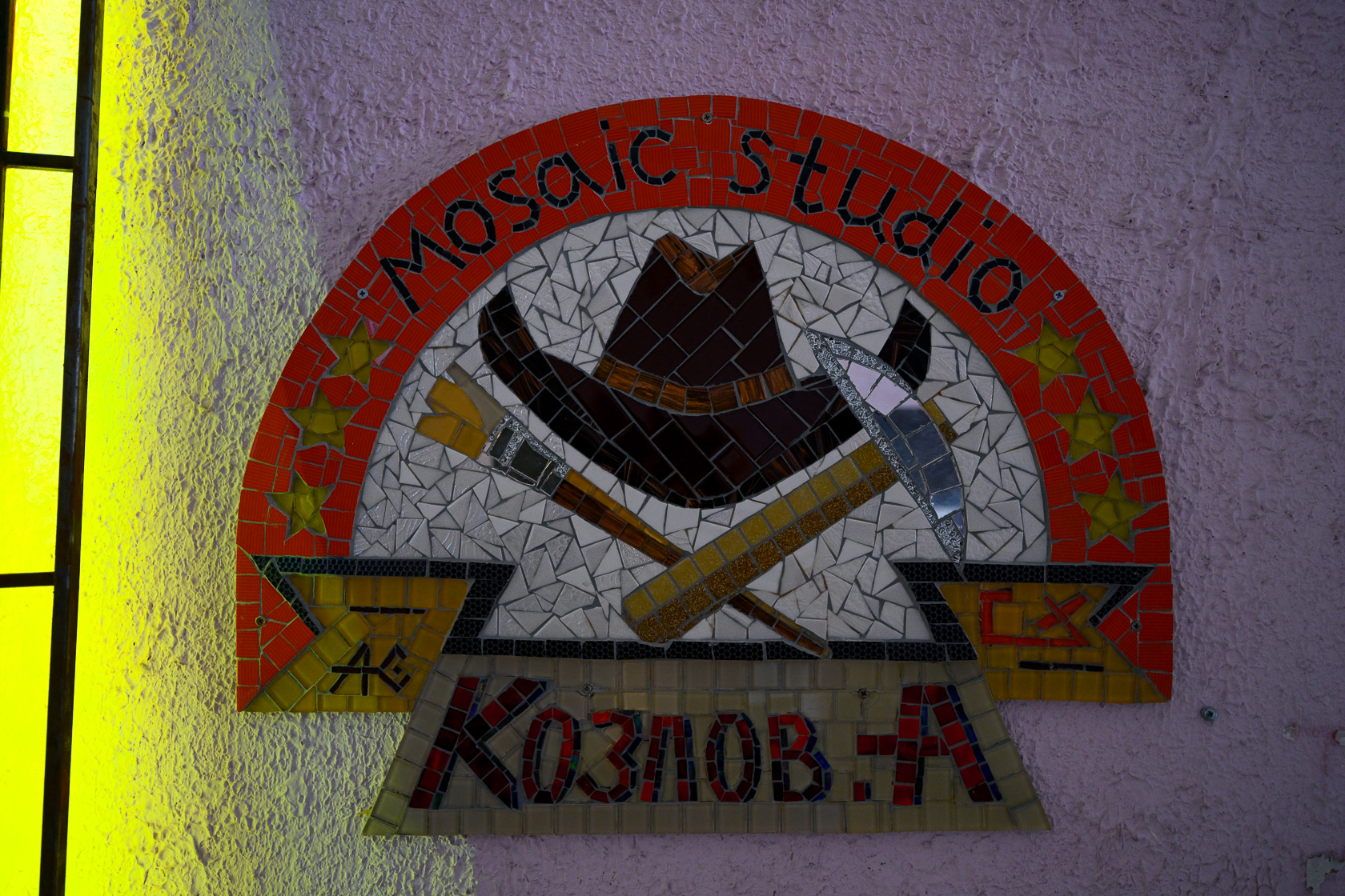 Не найти мастерскую мозаичиста Антона Козлова невозможно – как указатель в русских народных сказках, рядом со входом стоит огромная глыба с изображением мозаичного глаза. На двери – мозаичная же вывеска, рядом витраж с изображением райского дерева, светящийся изнутри.