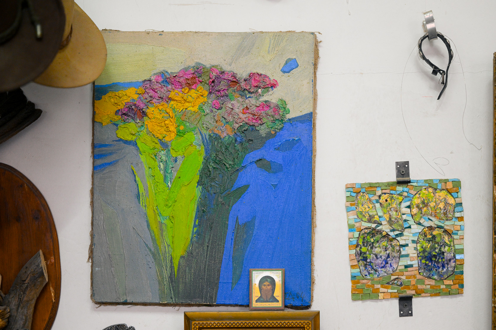 Над входом в мастерскую – небольшая картинная галерея. Например, картина с букетом написана Евгением Дороховым – они учились вместе с отцом Антона.