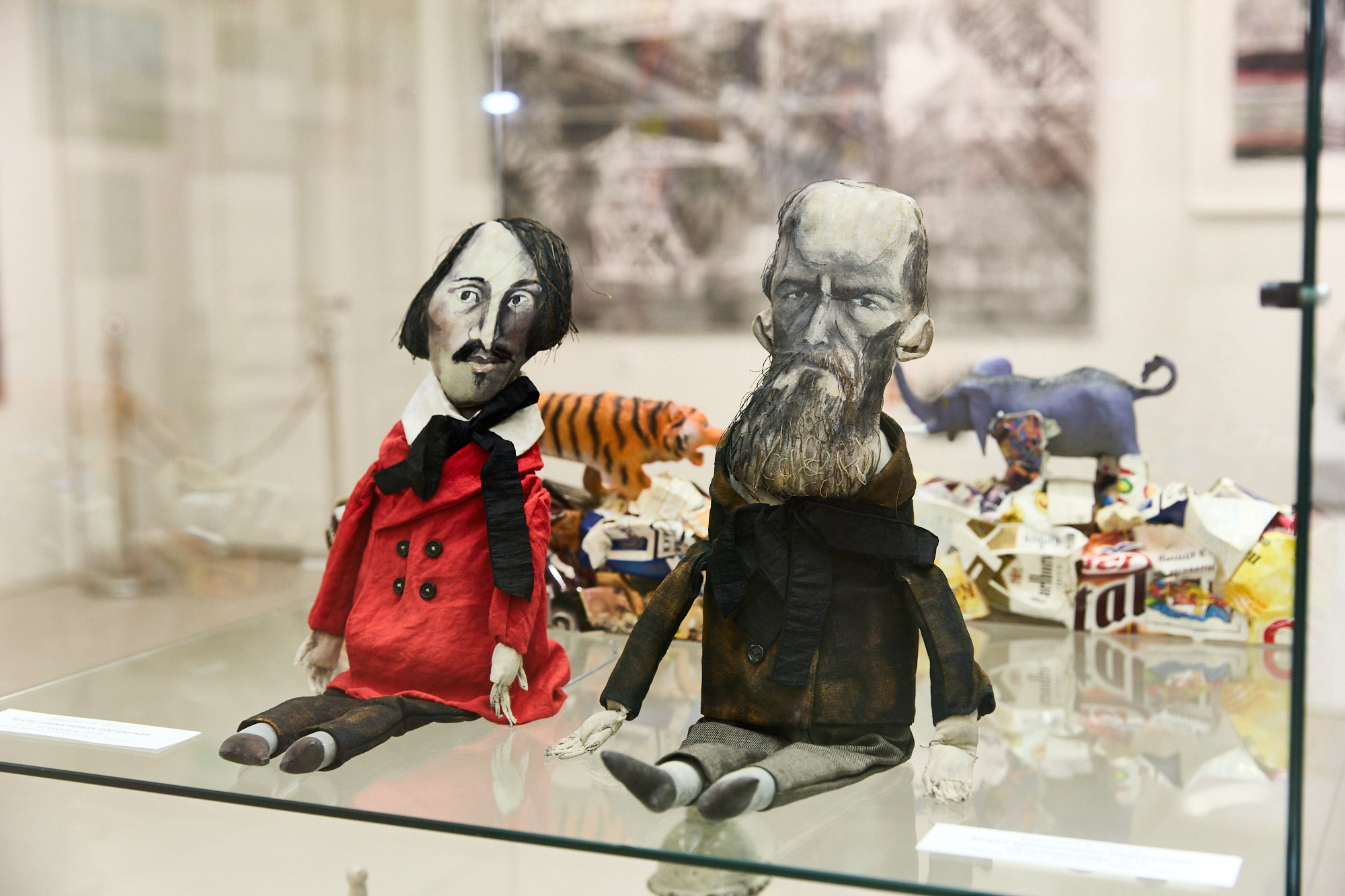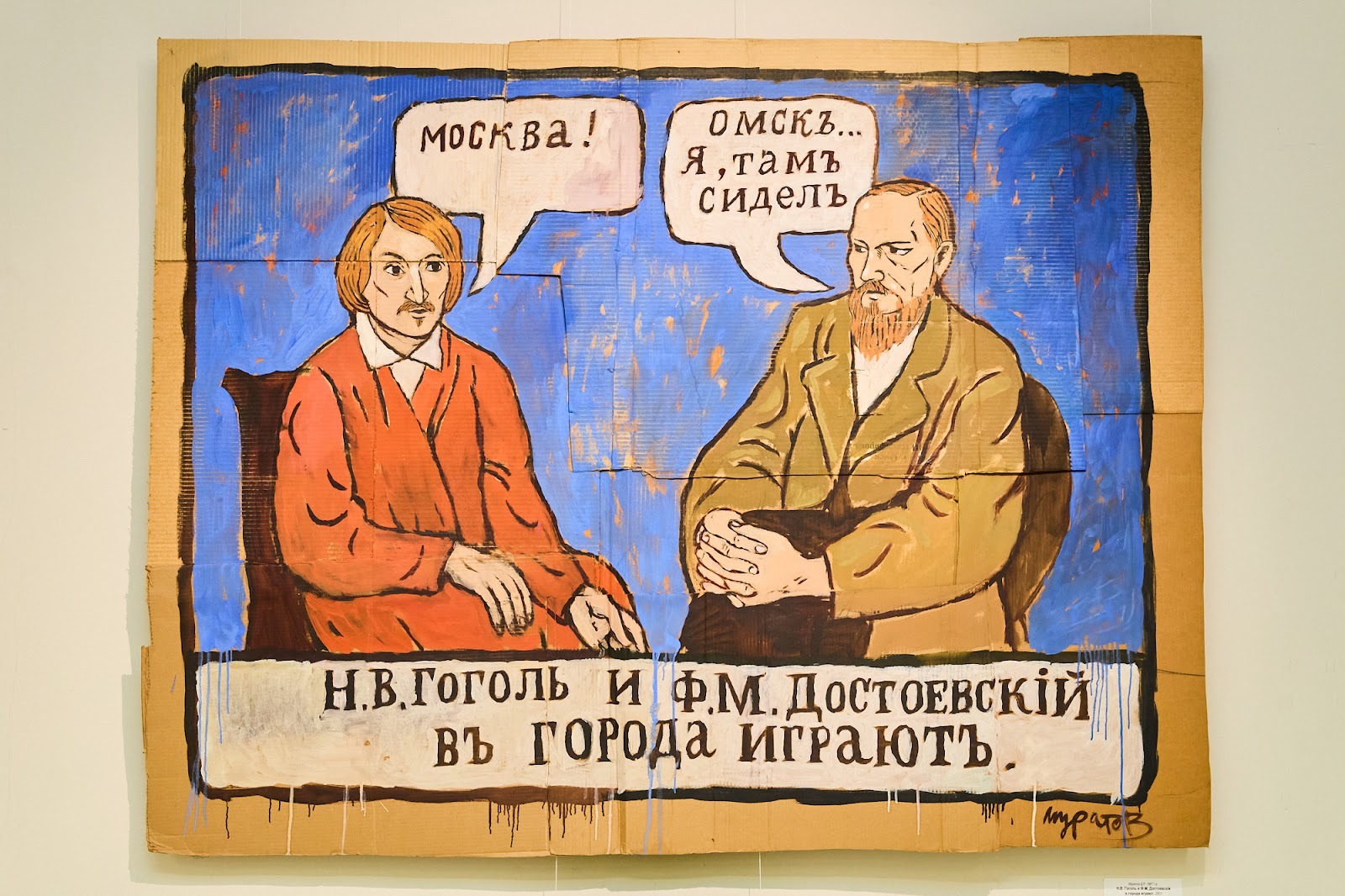 Следующие три условных четверти экспозиции показывают в целом понятный путь развития омского искусства – движение к новой нормативности с активным вышучиванием того, над чем пока ещё можно шутить. Например, золотой классики: Гоголь и Достоевский играют в города на картине, холстом для которой стала простая картонная коробка, и Фёдор Михайлович в ответ на Москву называет Омск (понятное дело, он тут сидел).