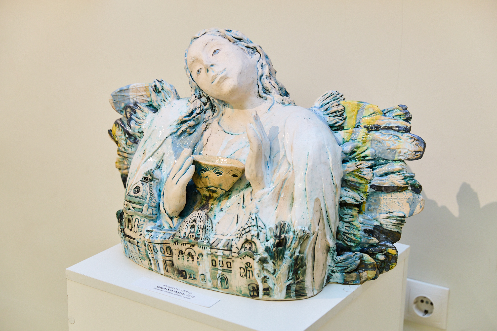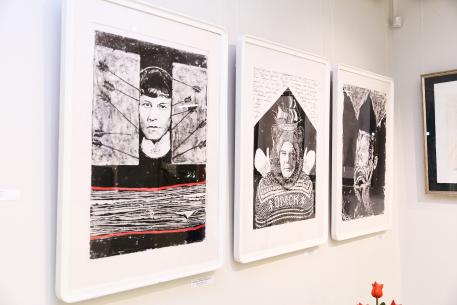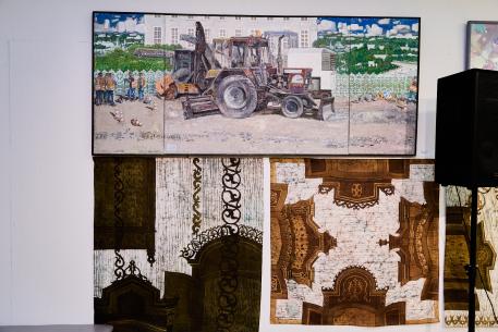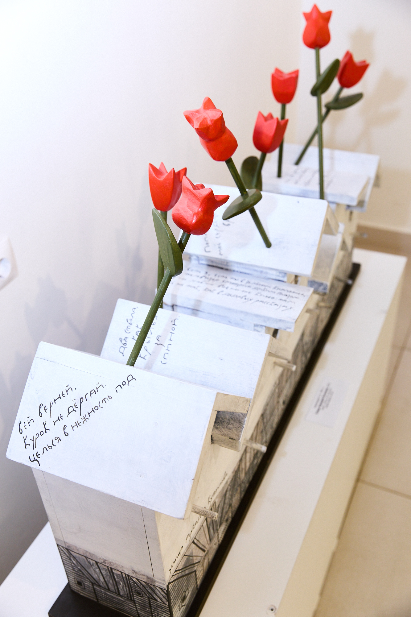 Кто-то после 90-х пытается уйти в эстетство (на картине «Изысканный бродит жираф» множатся профили Анны Ахматовой, художник Антон Сорокин рисует писателя Антона Сорокина), кто-то, наоборот, движется к примитиву. На выставке можно увидеть и объявление человека, ищущего уверенность в завтрашнем дне («Светлого будущего не предлагать!» – уточняет он сразу на всякий случай), и суровый триптих про пассажирский транспорт, и «портрет» бутылки из-под шампанского. По влиянием общего градуса креативности журналисты посчитали и праздничный торт инсталляцией, но нет, всё как в настоящий день рождения – поздравления, цветы, торт для всех и подарки.