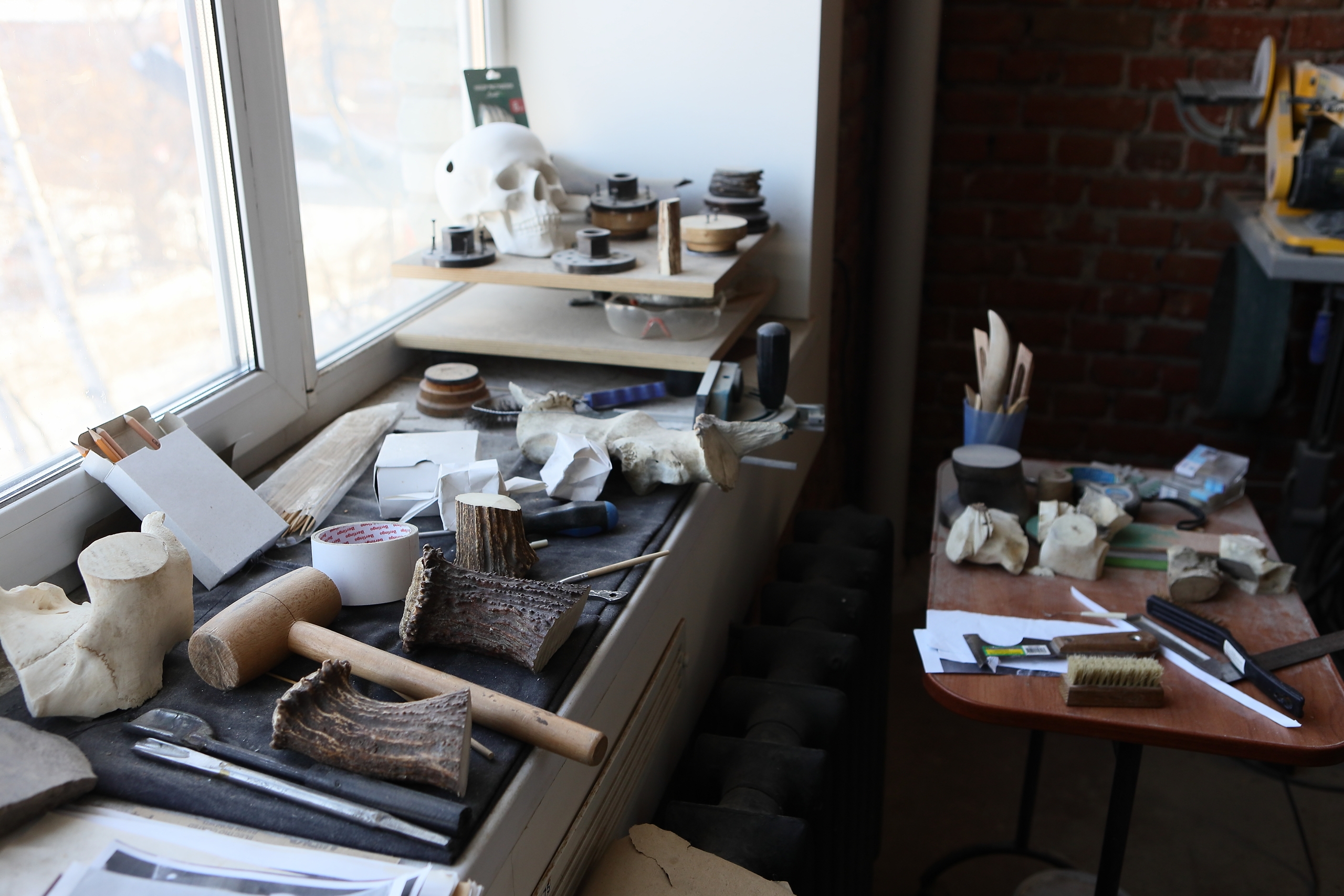 В этой мастерской Михаил работает только с костью мамонта. Не терпит древность конкурентов – как объясняет Михаил, для скульптур из кости такое соседство может быть опасным, к тому же крошка пенопласта и мрамора засыпает всё вокруг. Мрамор – натуральный и литьевой, дерево, другие материалы – Михаил работает со многими, но неизменно возвращается к своему любимому – кости мамонта. Здесь целая философия: