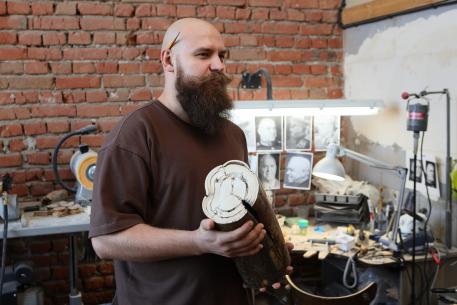 «Я вырос вне традиции. Вообще косторезное мастерство наиболее развито там, где вечная мерзлота – где кости больше всего и где она лучше всего сохранилась. В Якутии, например, крайне много мастеров. Есть четыре традиционные косторезные школы в России, ближайшая к нам тобольская. К нам это ремесло в современном виде пришло в середине пятидесятых годов – переехали косторезы из Тобольска, у них появились последователи. И я застал ещё тех самых тобольских косторезов – например, Александра Степановича Синицких, легенду в наших кругах. Он рассказывал мне, как его раскулачивали, очень долгую жизнь прожил. Мы с ним делали совместные работы. И я вне традиции сформировался – попал из художественной школы в студию-мастерскую Николая Васильевича Перистова, у него долгое время занимался, лет 10-12. Затем у меня в жизни появилась скульптура, я понял, как скульптура проникает в кость – так и пошло. Всё классическое образование, которое я получил на худграфе ОмГПУ, я воплощаю в кости».