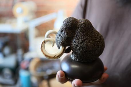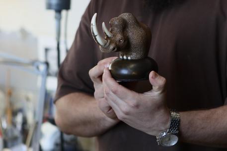 «Смелее, вы не в музее, здесь всё можно трогать», – с этими словами Михаил передаёт в наши руки фигурки мамонта, шерстистого носорога и бизона, все они когда-то обитали на территории Омской области. Выглядят фигурки весьма необычно для кости – они тёмно-коричневые и пористые. Оказалось, здесь использован другой материал – вертел бедренной кости мамонта. Его косторезы называют неподдельной костью. Глазки, нотки и бивни – из бивня мамонта, тщательно отполированного.