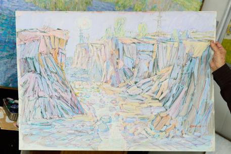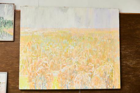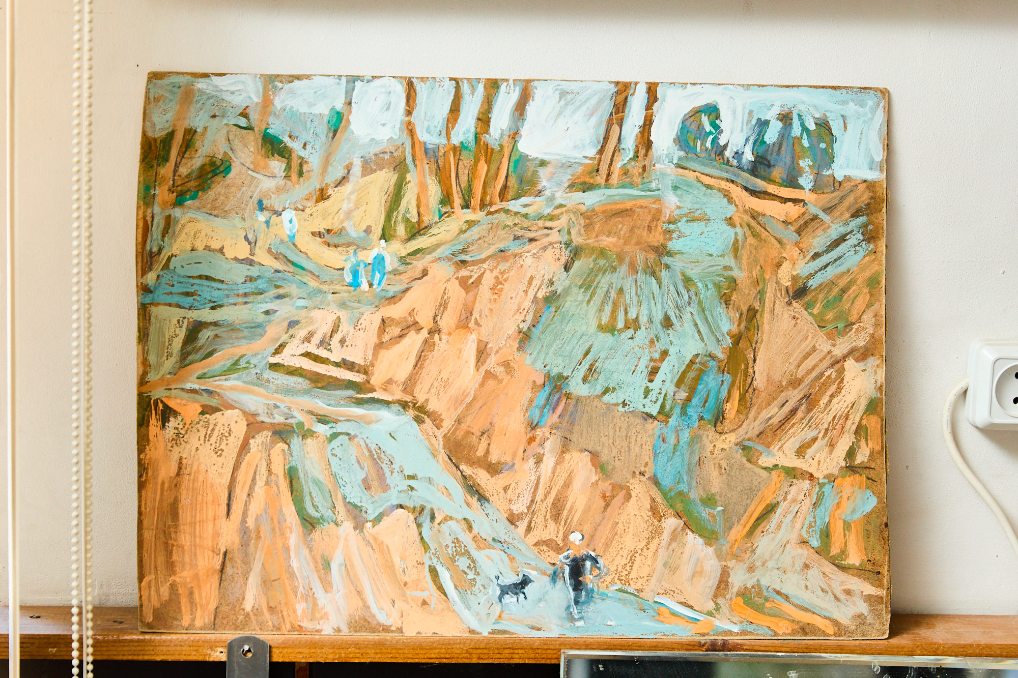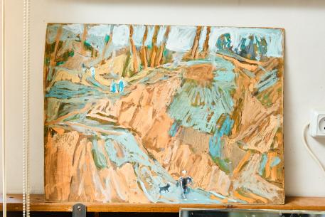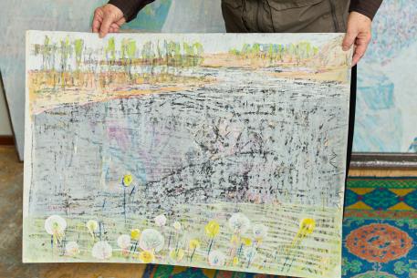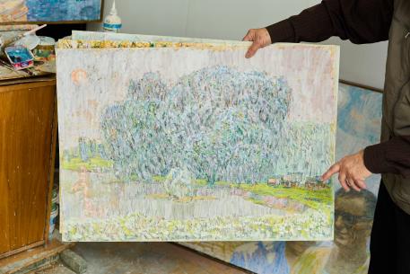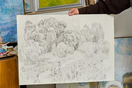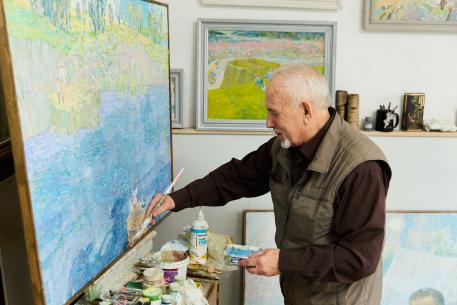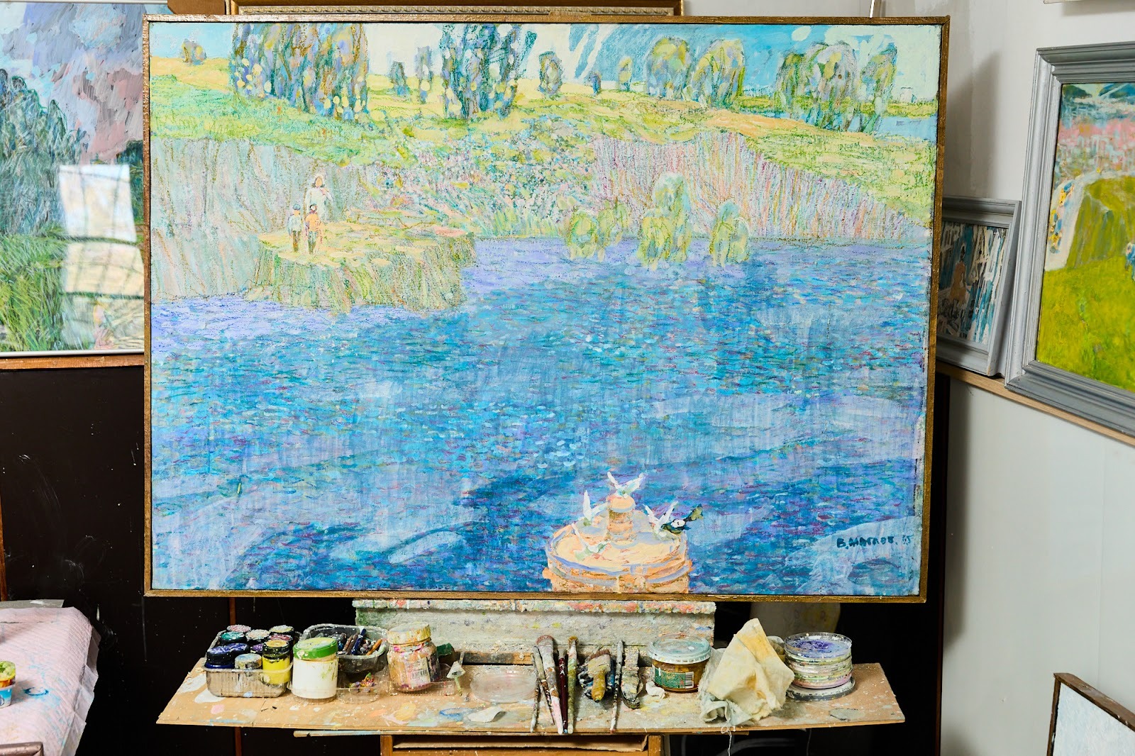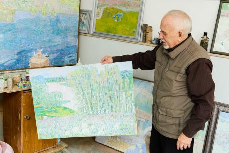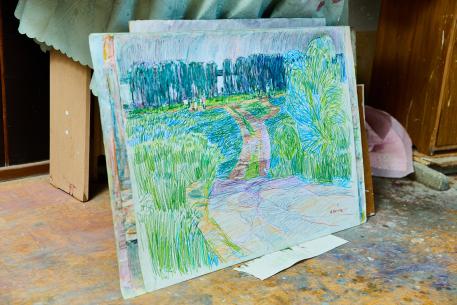 Но всё же любимый жанр Виктора Ивановича – пейзаж. Находим на столе целую стопку бумажных листов с пейзажными этюдами – художник рассказывает, что любит писать Зелёный остров, рядом с которым живёт. За последние годы набралось десятки этюдов – они тут же покрывают весь пол маленькой мастерской. Виктор Иванович рассказывает, что ему никогда не скучно пересматривать эти работы – всё равно что заново прогуляться по любимым местам.
