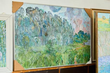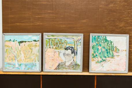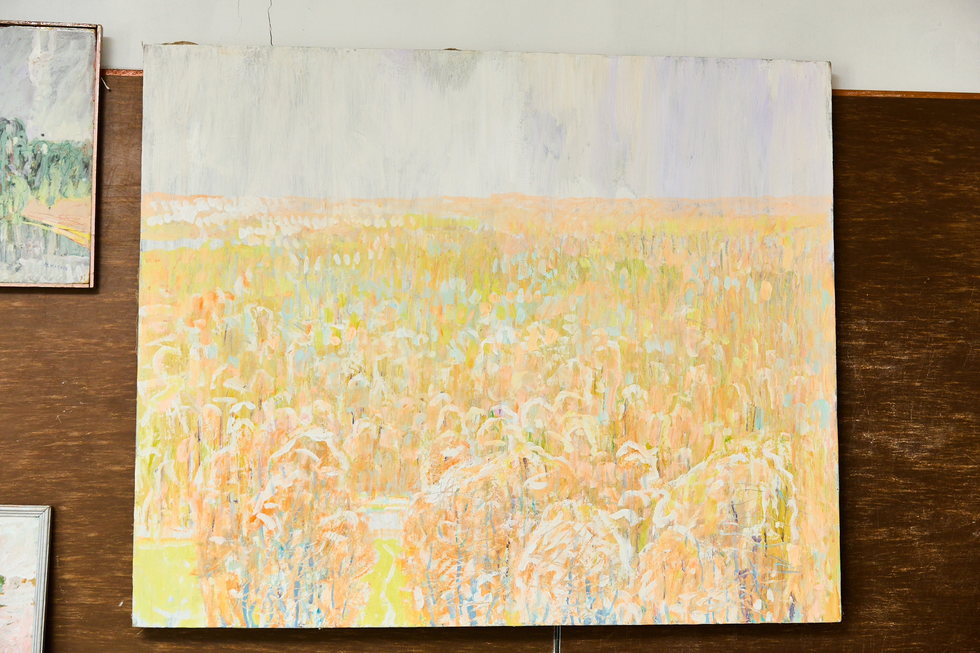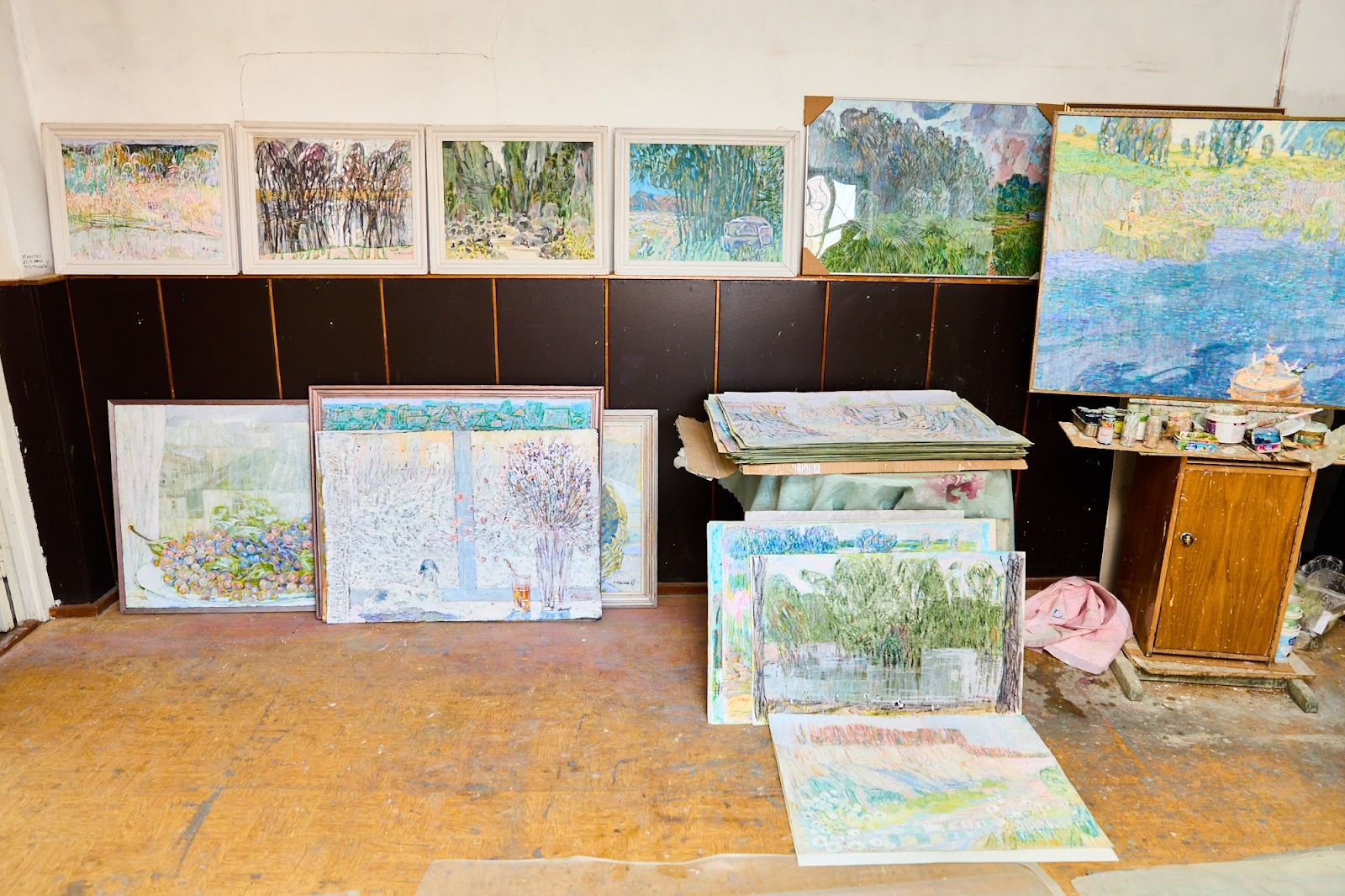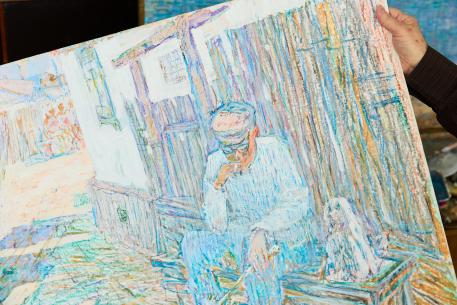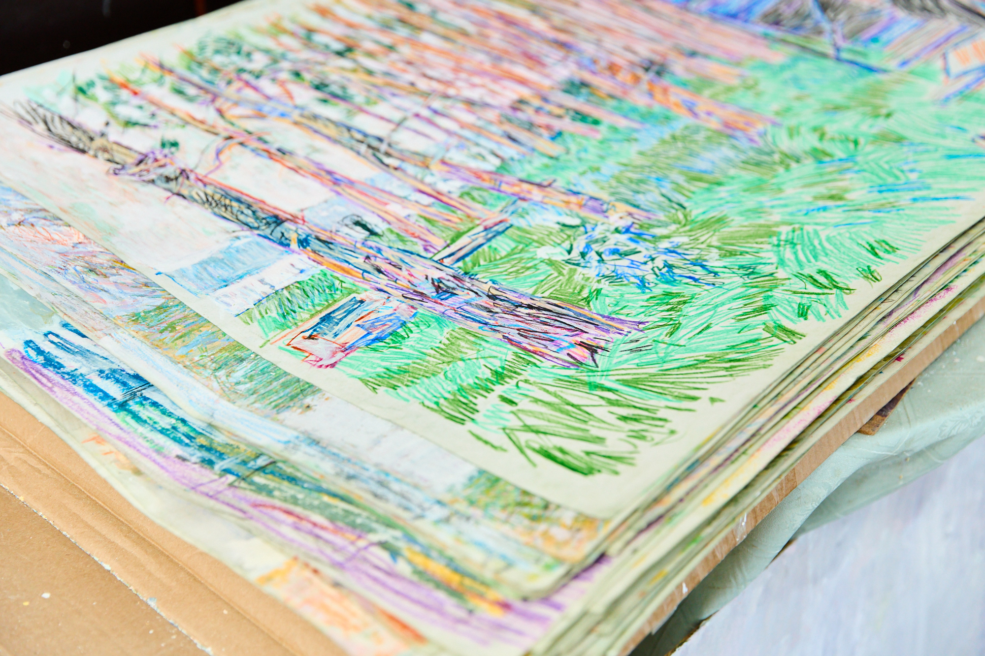 Но всё же любимый жанр Виктора Ивановича – пейзаж. Находим на столе целую стопку бумажных листов с пейзажными этюдами – художник рассказывает, что любит писать Зелёный остров, рядом с которым живёт. За последние годы набралось десятки этюдов – они тут же покрывают весь пол маленькой мастерской. Виктор Иванович рассказывает, что ему никогда не скучно пересматривать эти работы – всё равно что заново прогуляться по любимым местам.