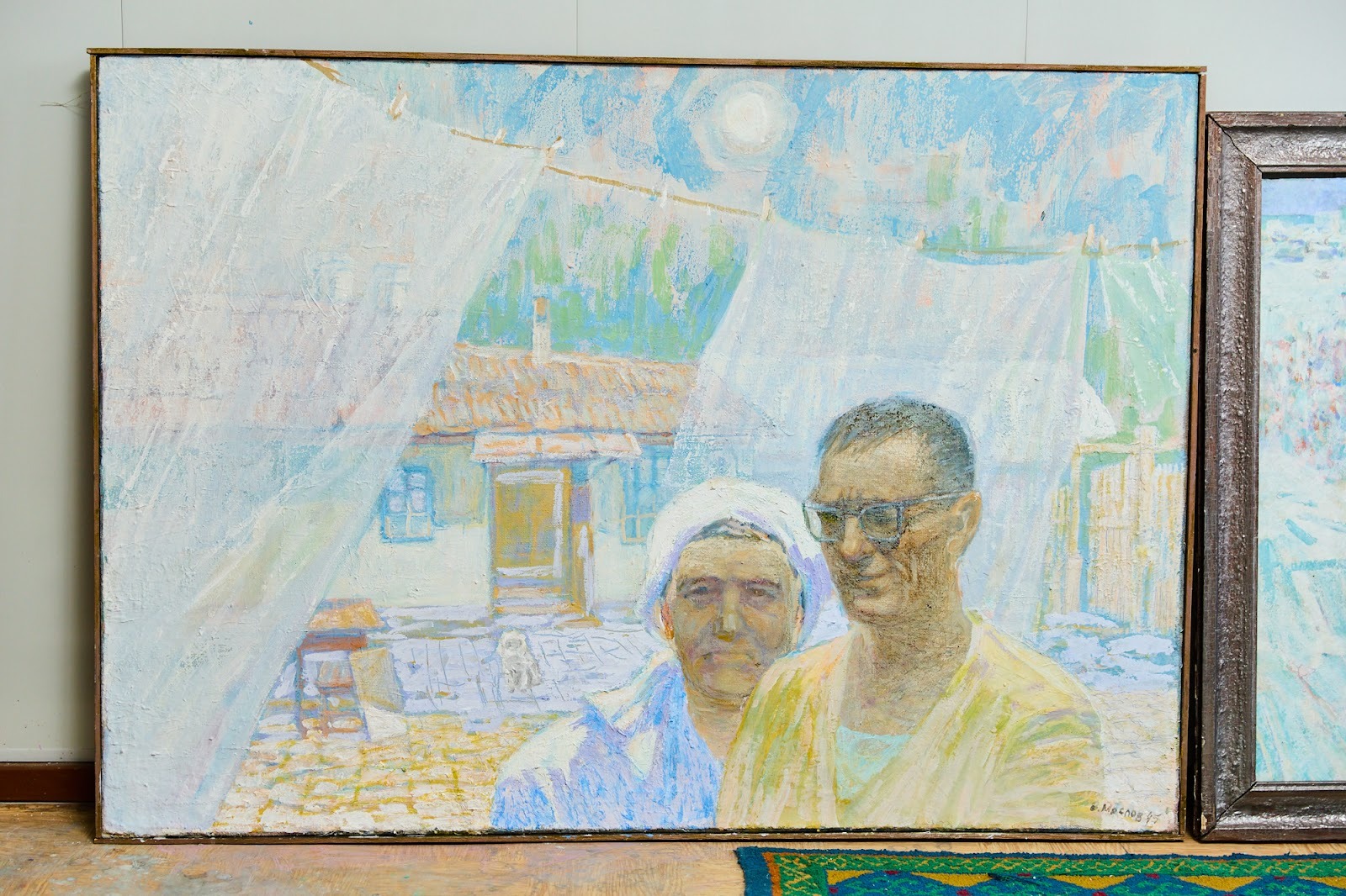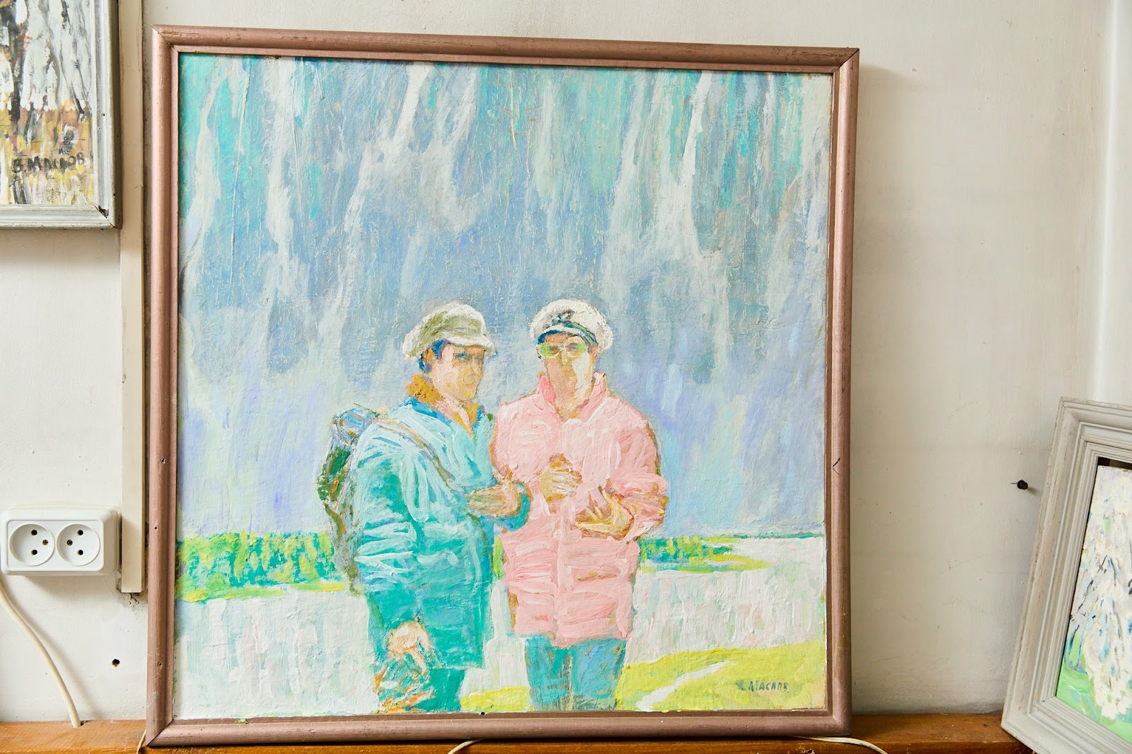В ответ на просьбу рассказать о дорогих ему картинах в мастерской Виктор Иванович, как перед иконой, застывает перед портретом немолодой пары, изображённой на фоне гор.