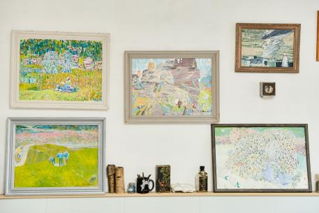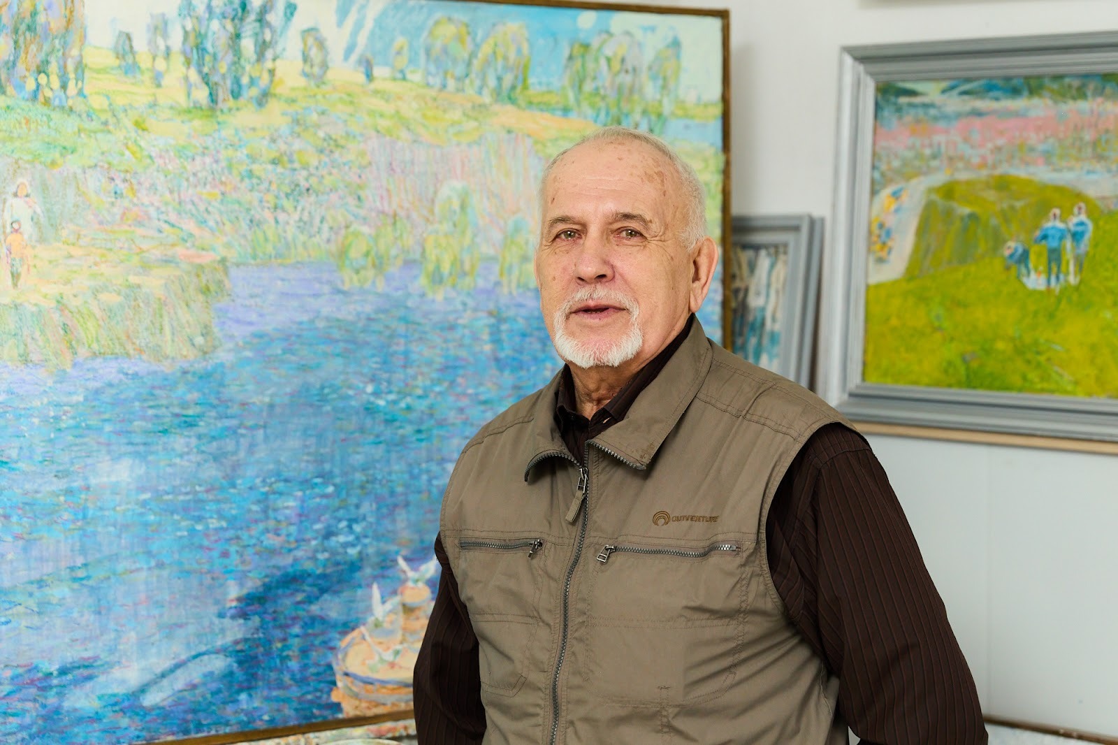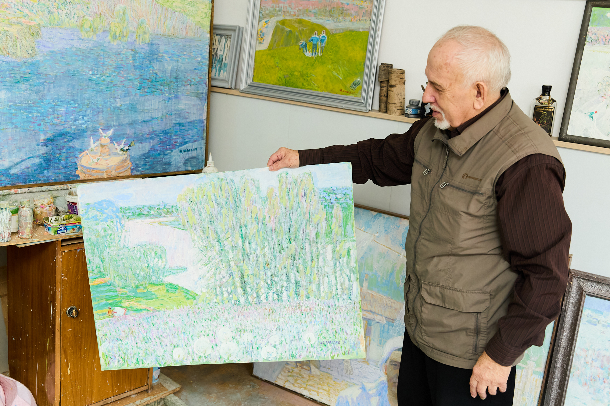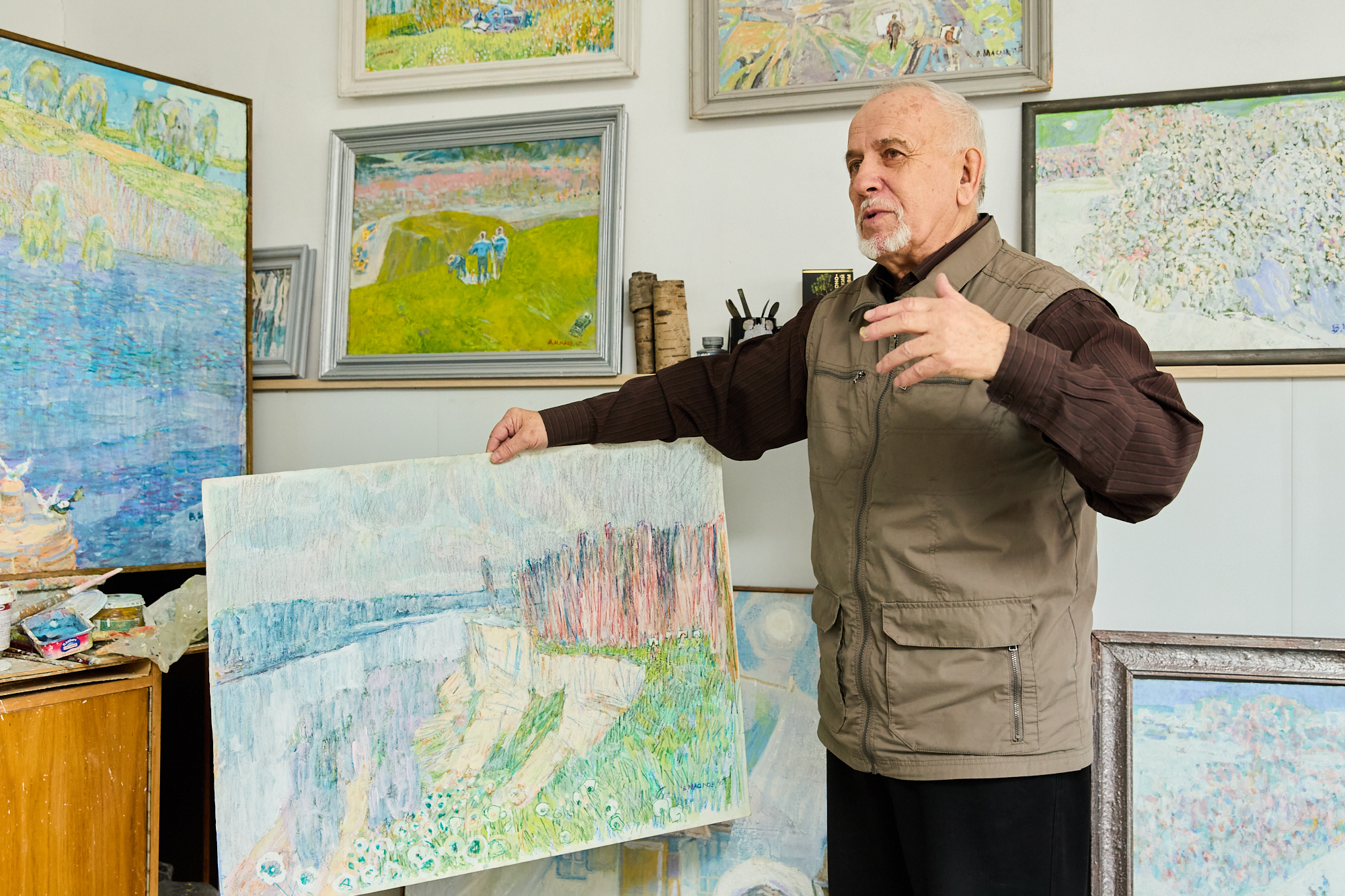 Виктор Иванович встречает нас в своей небольшой мастерской, полностью уставленной картинами. «Готовился к вашему визиту и выставлял картины. Сам удивился – как можно по-другому посмотреть на работы, которые писал давно! Прихожу сюда 3-4 раза в неделю, работаю с литературой, репродукциями и, конечно же, пишу».
