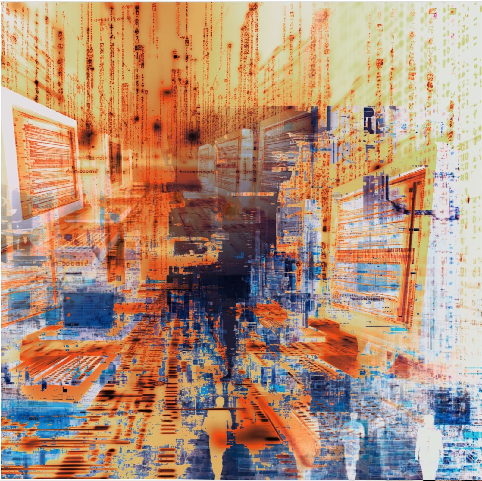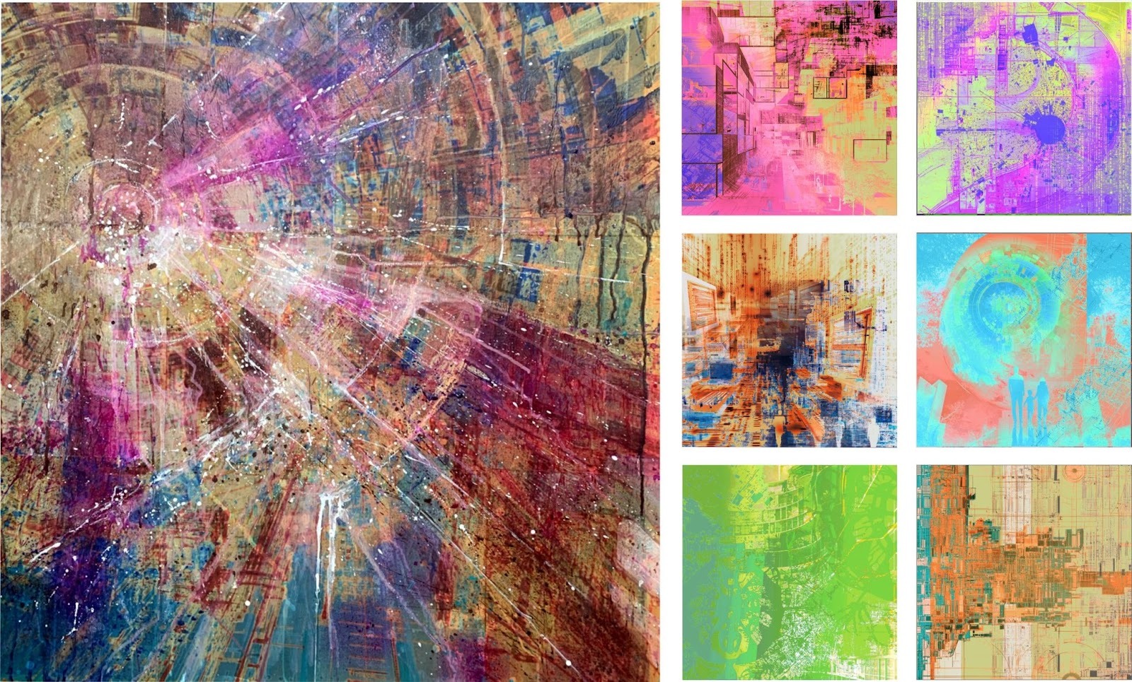 «Город здесь — не декорация, а актор, чья алгоритмическая и инфраструктурная логика переформатирует саму ткань повседневности. В этой серии я работаю слоями: генеративный слой, с использованием искусственного интеллекта и графических редакторов; материальный слой — тактильные “кирпичи” коллажа, печать на холсте как акт овеществления цифрового; и, наконец, живописный слой — абстрактный след человеческого жеста, эмоциональная картография, нанесённая поверх цифровой матрицы».