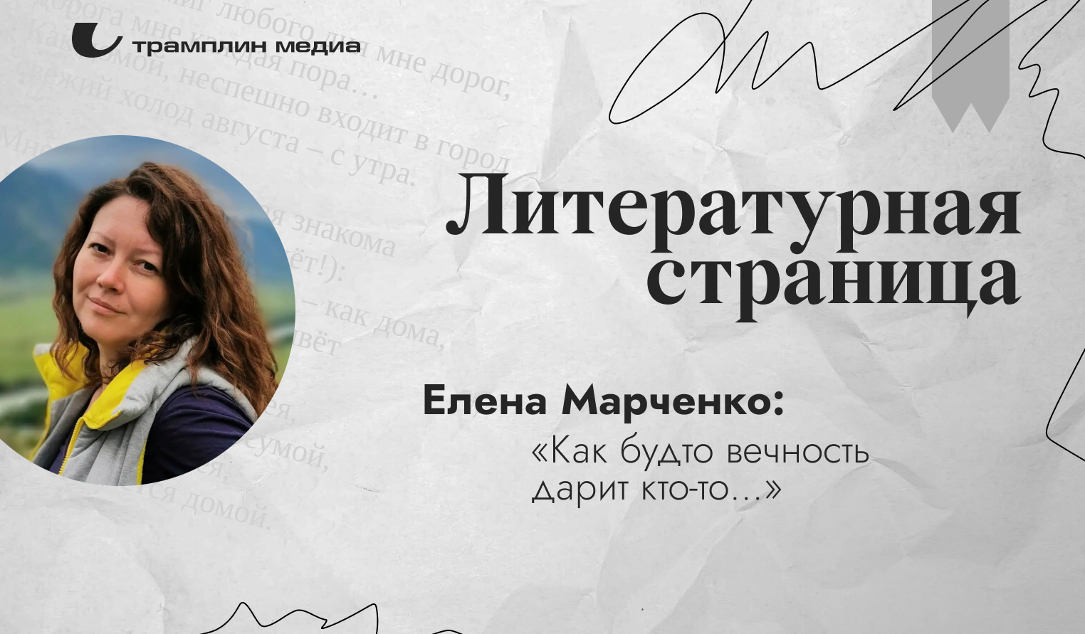 Марченко Елена Васильевна родилась 16.02.1983 г. в Омске. Окончила экономический факультет Омского государственного университета имени Ф.М. Достоевского. Автор поэтических сборников «Паутинки из солнечных дней» (2018), «Дыхание марта» (2018). Стихи также печатались в сборниках «Очарование осени» (2015), «Омская зима» (2018), «ОНОН» (2018), «Антология молодежной поэзии России «111»» (2020), «Пространство стиха» (2022), «Координаты СВОим» (2023), «Среди миров. Книга Любви» (2024), журналах «Литературный ковчег», «Омская муза», «Симбирскъ», «Литературный Омск», «Парус», «Веретено», «Образ», в газетах «День литературы», «Литературный Санкт-Петербург». Лауреат областной молодёжной премии имени Ф.М. Достоевского (2018), Омской региональной премии имени В.А. Макарова (2019), лауреат фестиваля авторской песни и поэзии «Камертон». Член Союза писателей России.