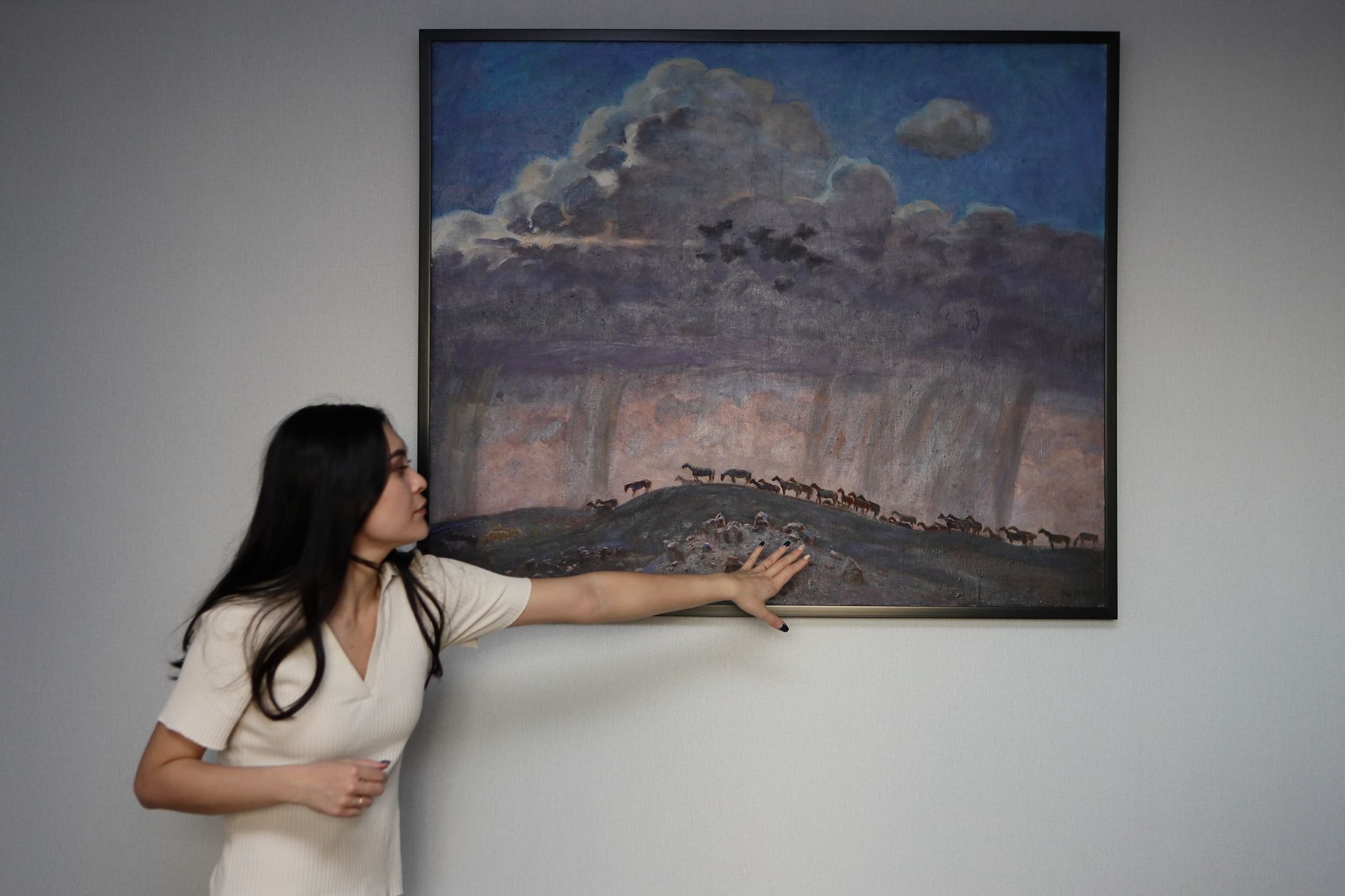 «Работа называется “В степи”. Но это не про степь. Это про небо. Оно здесь такое грозовое, дождливое. Я прямо чувствую запах дождя, когда смотрю. И знаете, я никак не могу сосчитать лошадей. Каждый раз разное количество получается. То ли я что-то упускаю, то ли есть здесь какая-то загадка».