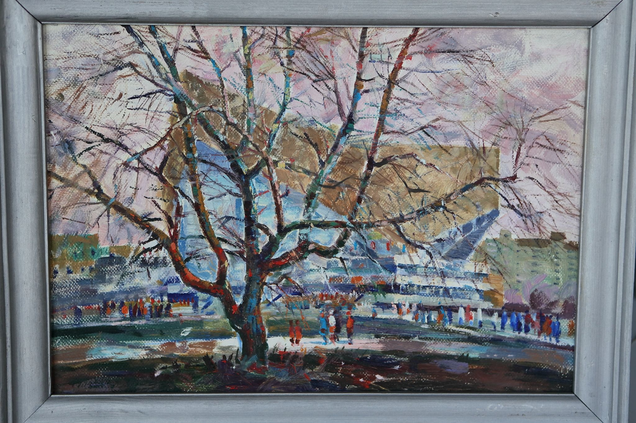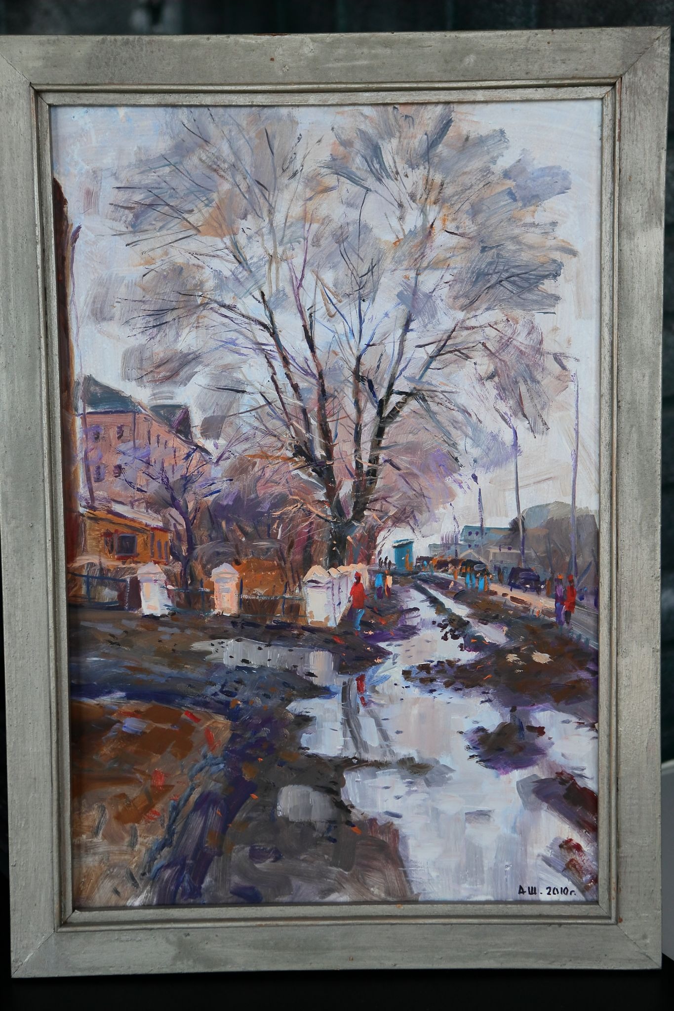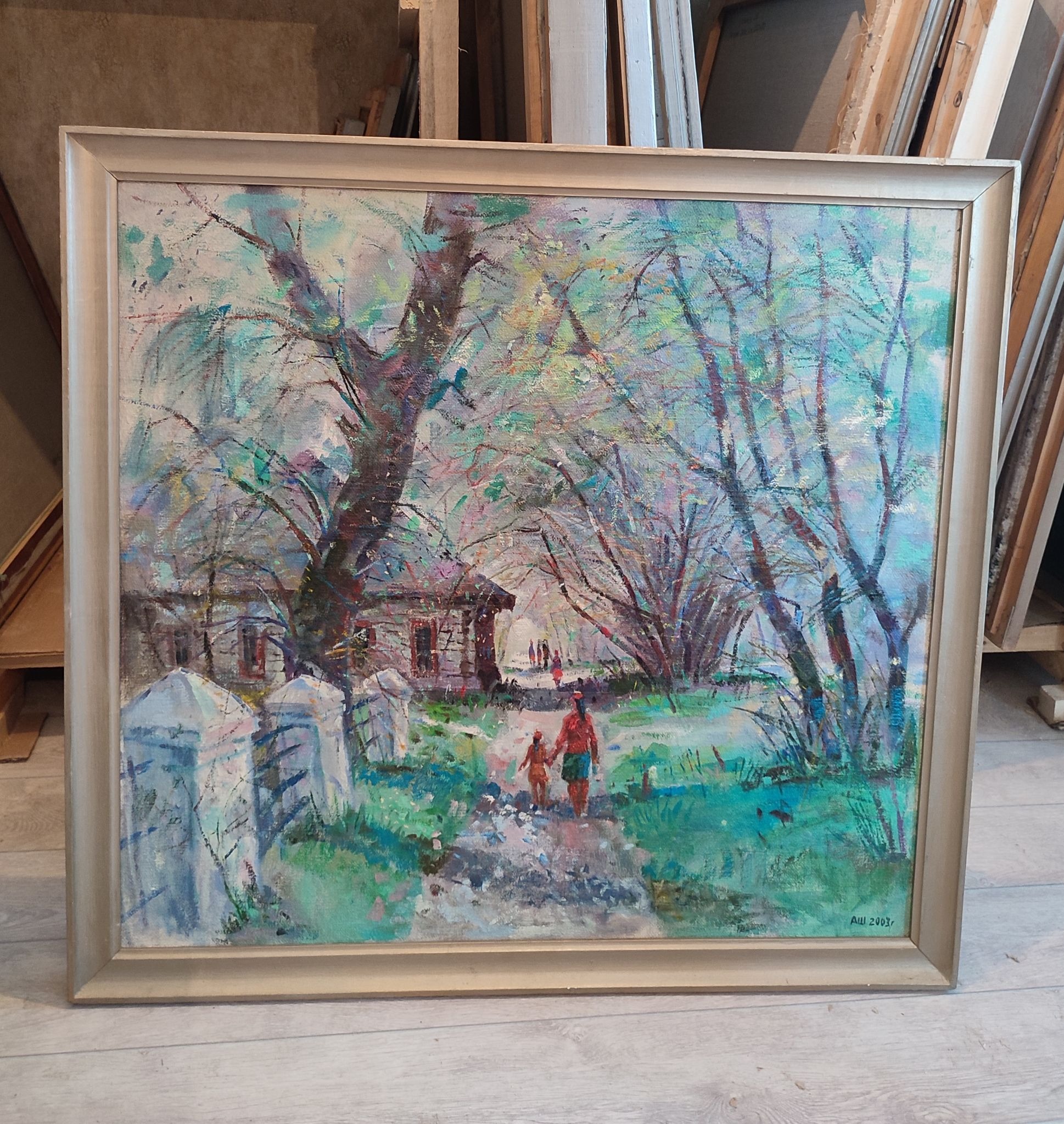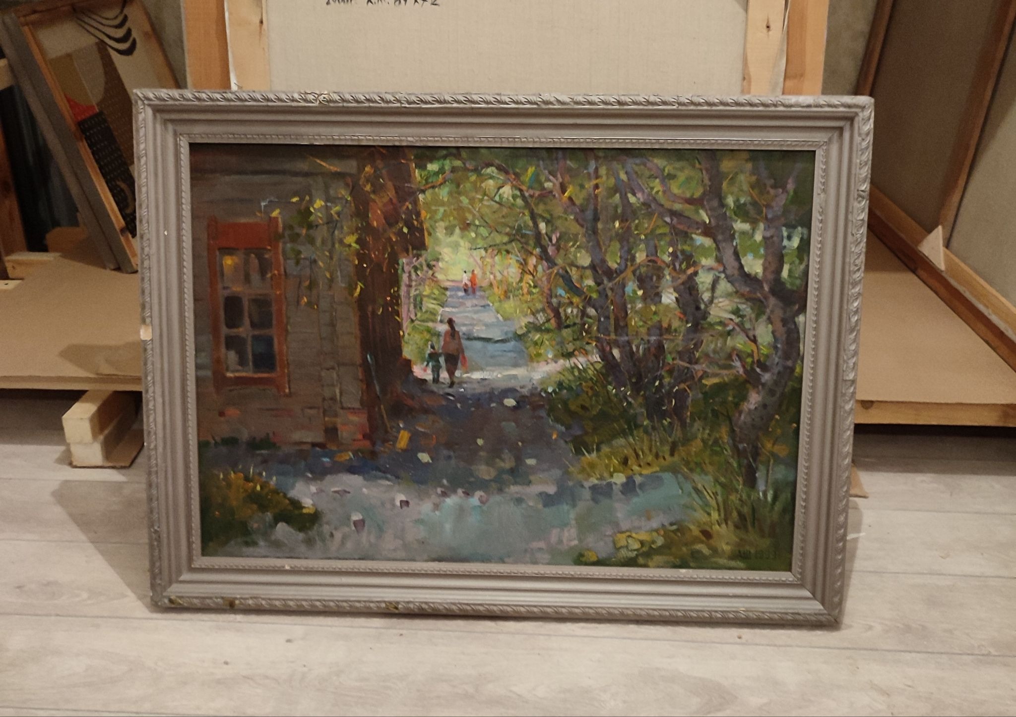 Есть серия работ с улицы Куйбышева, где мы жили. Там раньше стоял деревянный дом — мастерская скульптора. Он сгорел, даже фотографии не осталось. Только на папиных полотнах можно его увидеть. Папа писал это место в разное время года — как импрессионисты, один и тот же мотив в разных состояниях. У меня есть четыре варианта: зима, лето, весна и осень. И почти на каждом — мы с мамой. Потому что он оставался писать, а мы куда-то уходили.