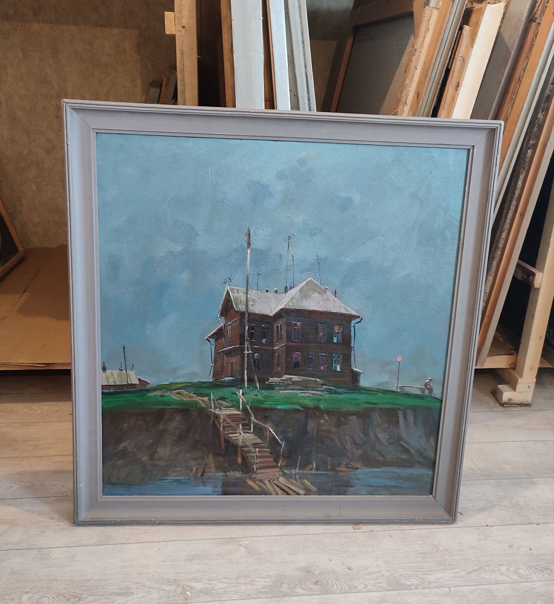 И “Дом на берегу”. Я её увидела уже после папиной смерти, когда разбирала мастерскую. Она для меня — про спокойствие и тревогу одновременно. Одинокий дом на отшибе. Вызывает шевеление нервных окончаний, но тона не кричащие, мягкие. И от этого внутри всё затихает».